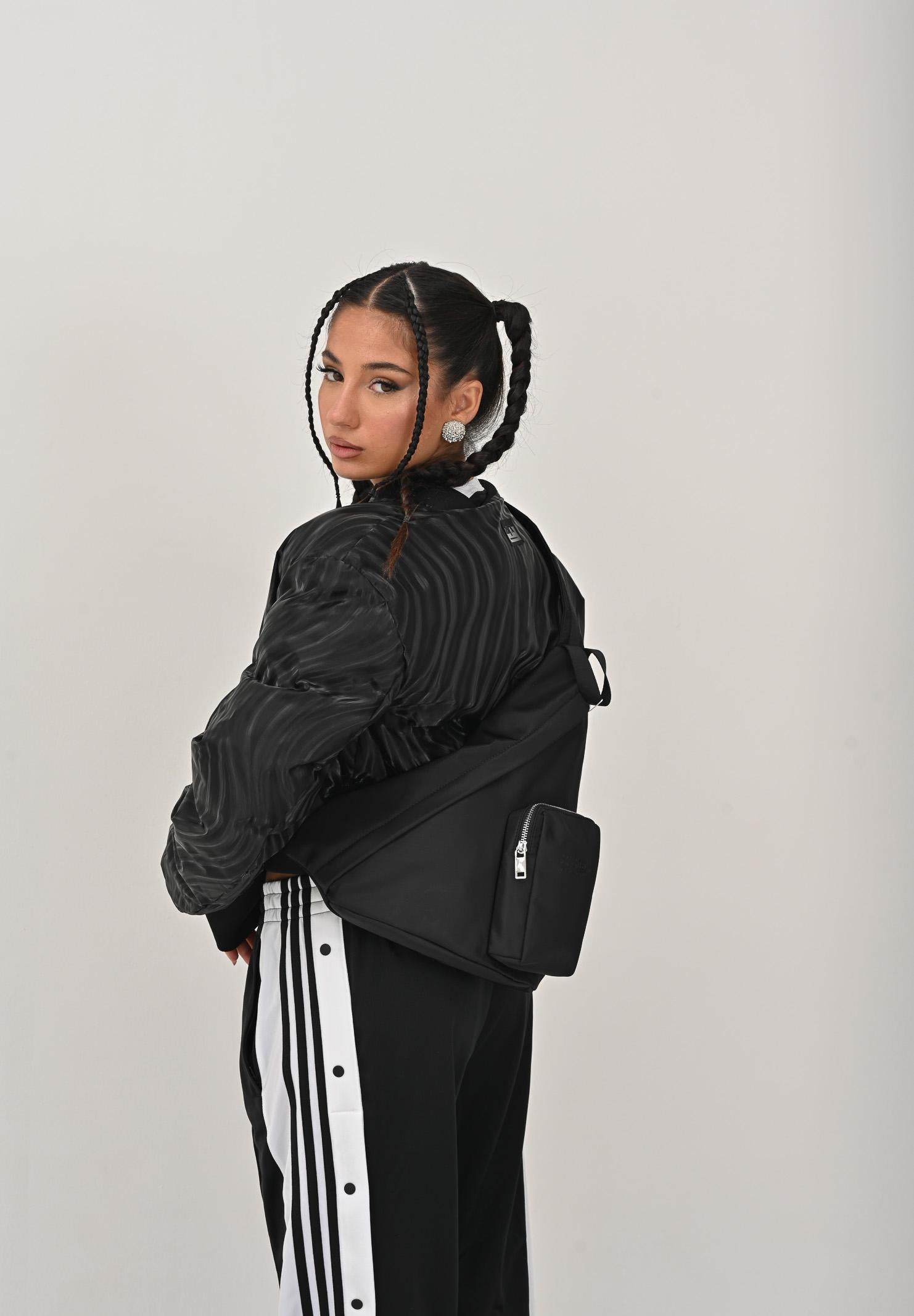 MAISON MARGIELA Women's black Japanese Sling Bag. Featuring a triangular silhouette. Front pocket with tone-on-tone Numeric logo. Adjustable shoulder strap. Hidden front zip closure. Iconic stitching on the back. A reinterpretation of MM6's most emblematic accessory, revisited from the adult collection. Dimensions: 36 cm high, 8 cm wide, 31 cm long. Handle drop: 8 cm. Shoulder strap length: 68 cm. Fall/Winter season.