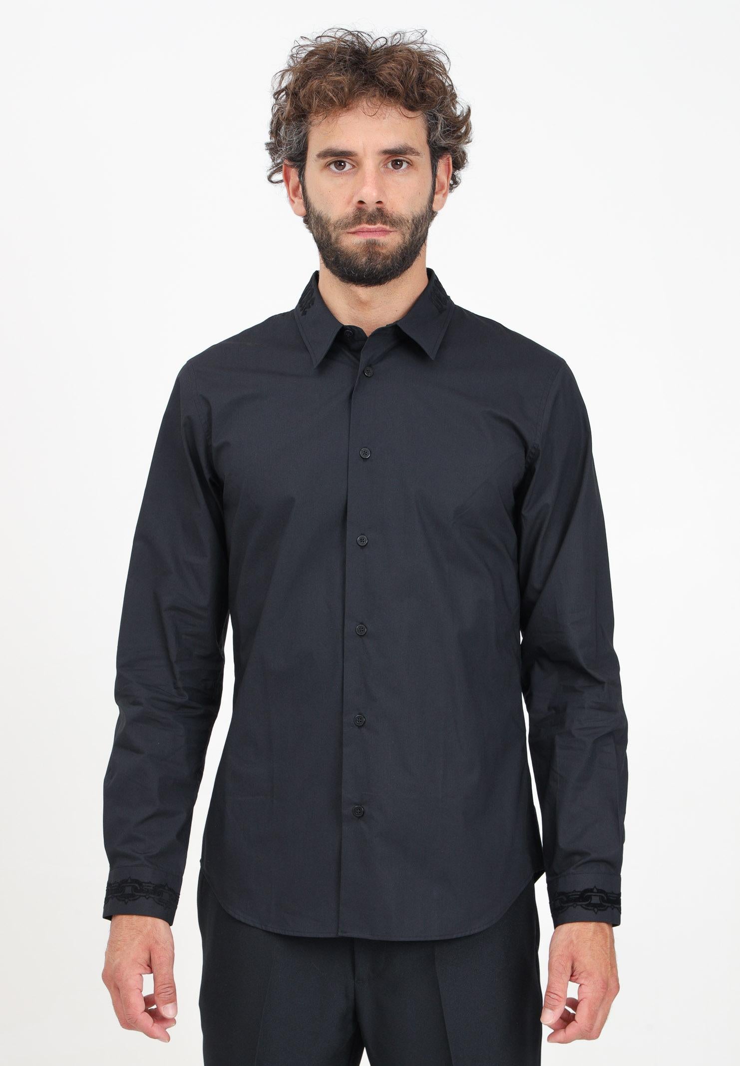 VERSACE JEANS COUTURE Black men's elegant shirt with gothic-style logo finished in velvet. The garment features a button closure and pointed collar. The model wears a size 48 and is 187cm tall. We recommend washing and ironing at medium temperature. Autumn winter season.