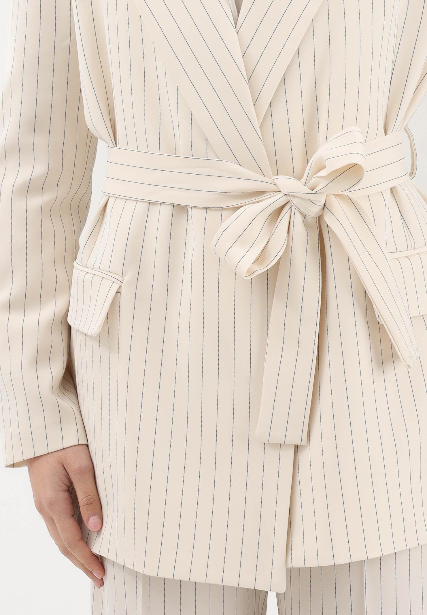 VICOLO Giacca panna da donna dal taglio sartoriale e dalla linea elegante, caratterizzata da un design raffinato e femminile. Realizzata in tessuto chiaro con delicata gessatura verticale a contrasto, slancia visivamente la silhouette e richiama lo stile tailoring classico. Il modello presenta rever ampio, chiusura frontale con cintura coordinata da annodare in vita che permette di regolare la vestibilità e valorizzare il punto vita. Le maniche lunghe e le tasche con pattina completano il design con un tocco funzionale e sofisticato. Sul retro, lo spacco centrale assicura comfort e libertà di movimento. Una giacca versatile e ricercata, ideale da indossare in completo con il pantalone coordinato o come capo protagonista per look eleganti e contemporanei. La modella indossa una taglia S ed è alta 170cm. Si consiglia un lavaggio ed una stiratura a media temperatura. Stagione primavera estate.