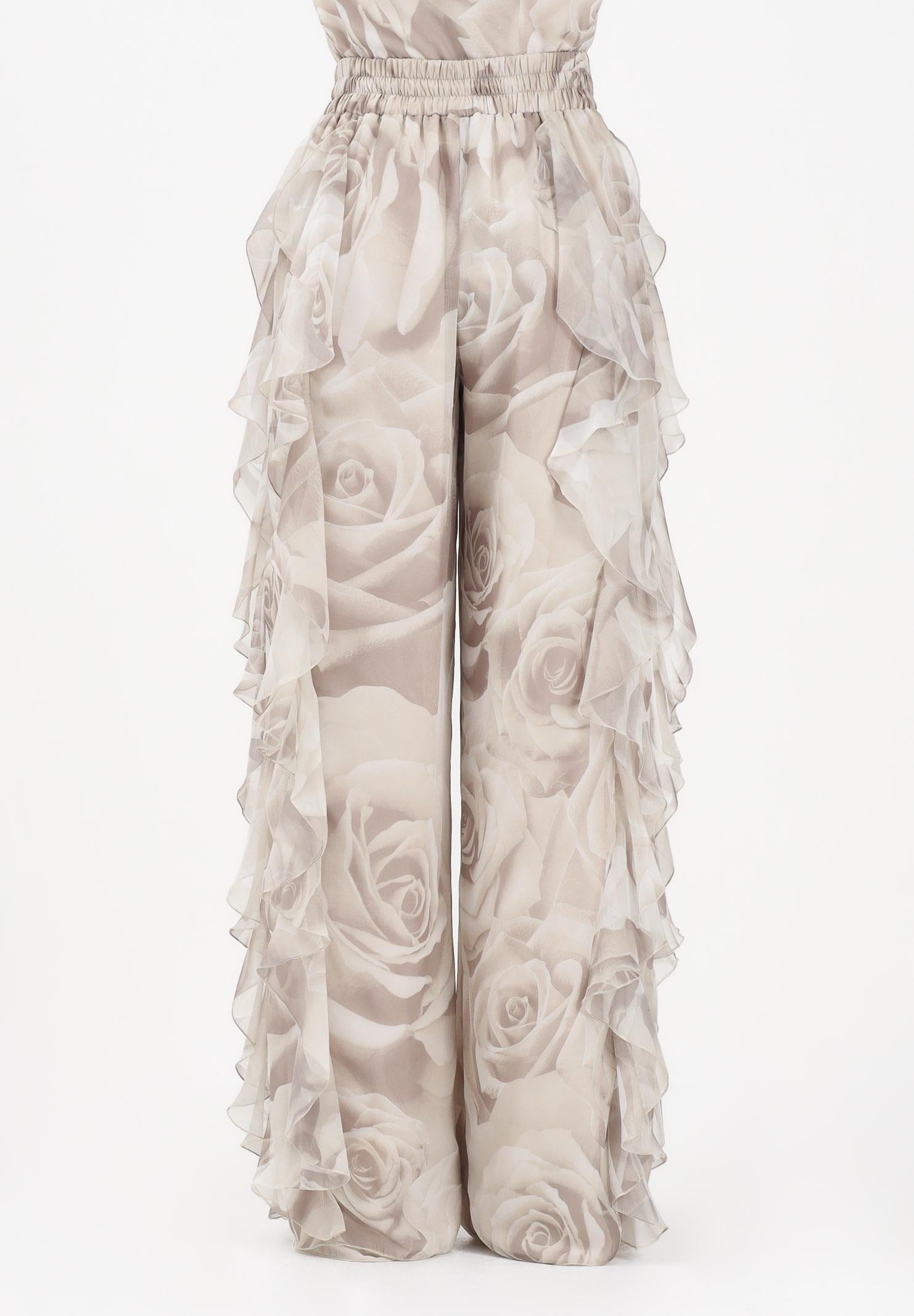 SHIT Elegant beige women's trousers crafted from lightweight, weightless fabric with a delicate tone-on-tone floral print. The style features a loose, flowing silhouette that follows movement, enhanced by soft chiffon ruffles along the sides, which add volume and an elegant fluttering effect. The high, elasticated waistband is designed to ensure comfort and a harmonious fit, flattering the figure without constricting. The expertly balanced transparency of the fabric creates a sophisticated sheer effect, making this garment feminine and refined, ideal for special occasions or elegant looks with a romantic, contemporary feel. The model wears a size 40 and is 175 cm tall. Delicate washing and medium-heat ironing are recommended. Spring/Summer season.