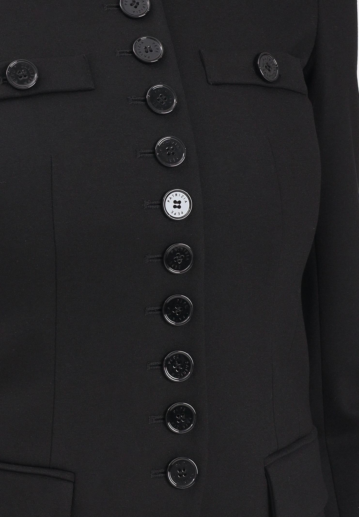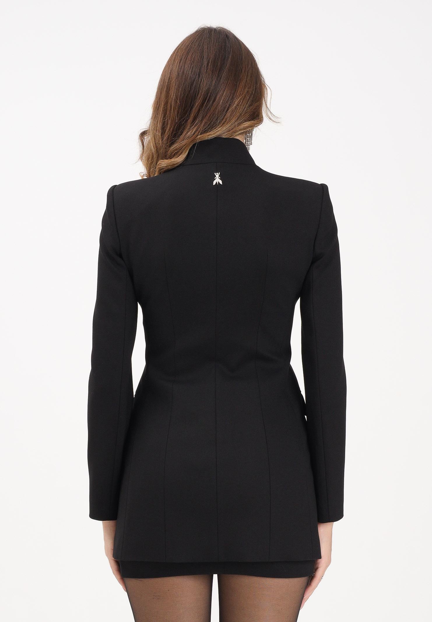 PATRIZIA PEPE Radical Rose women's black officer jacket. Patrizia Pepe's "officer" spirit is reinvented in the essential volumes of this fitted jacket with a mandarin collar in stretch fabric. Structured and with a sculptural design, it envelops the figure with boldness. Designed as a total look with the matching mini skirt, it creates a statement look where masculine and feminine blend in a play of glamorous contrasts. The model wears a size 40 and is 170 cm tall. Wet wash recommended. Fall/Winter season.