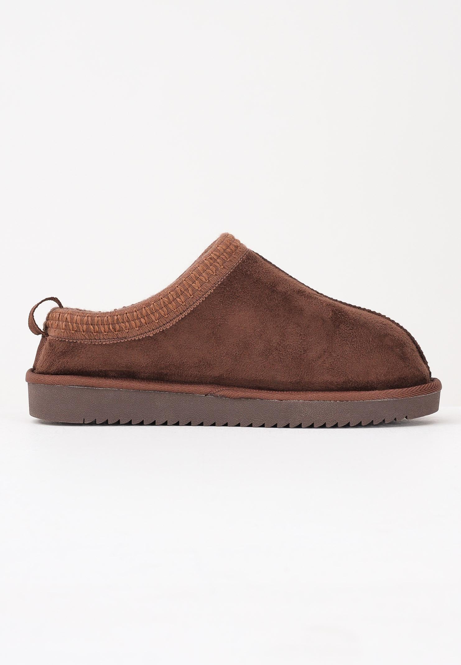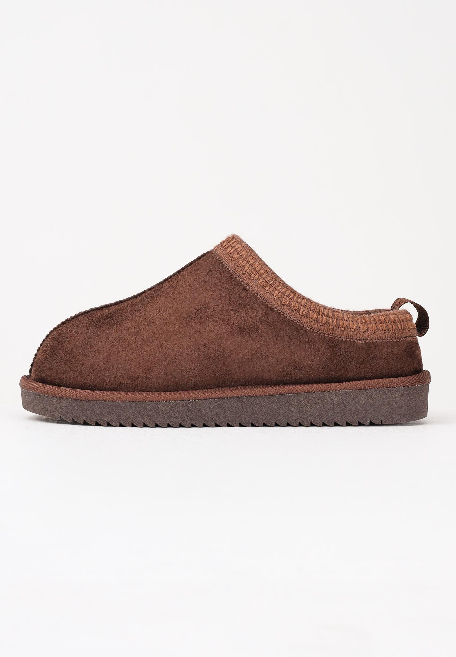 ONLY women's brown faux suede loafers feature a faux fur lining for comfort and warmth. The design features decorative stitching along the edges and a ridged rubber sole for improved grip. These shoes are perfect for a casual, relaxed look, ideal for the cold season thanks to their soft, cozy padding. Fall/Winter season available.