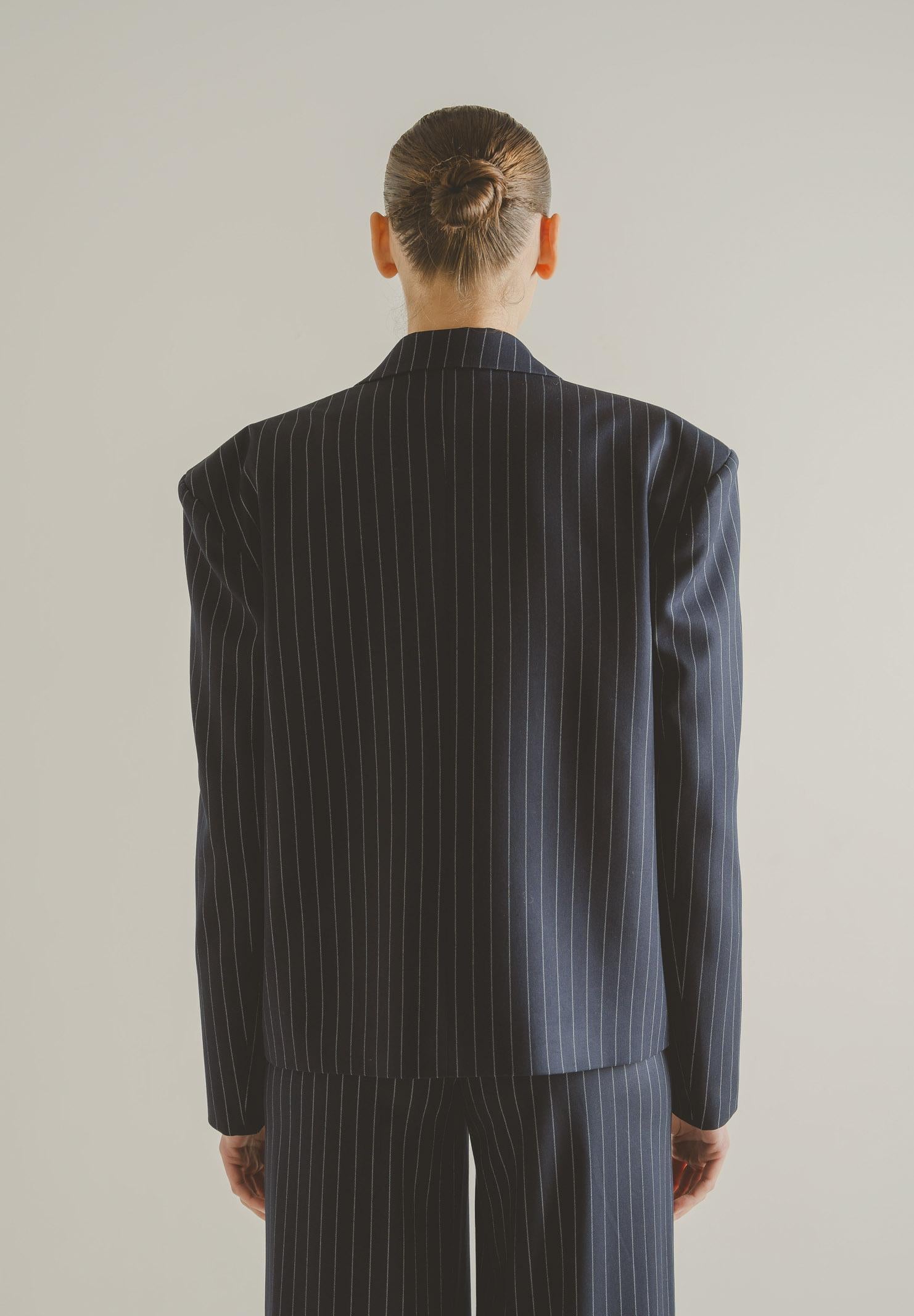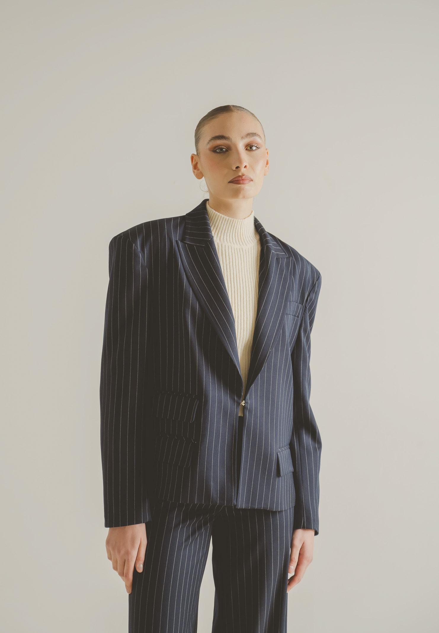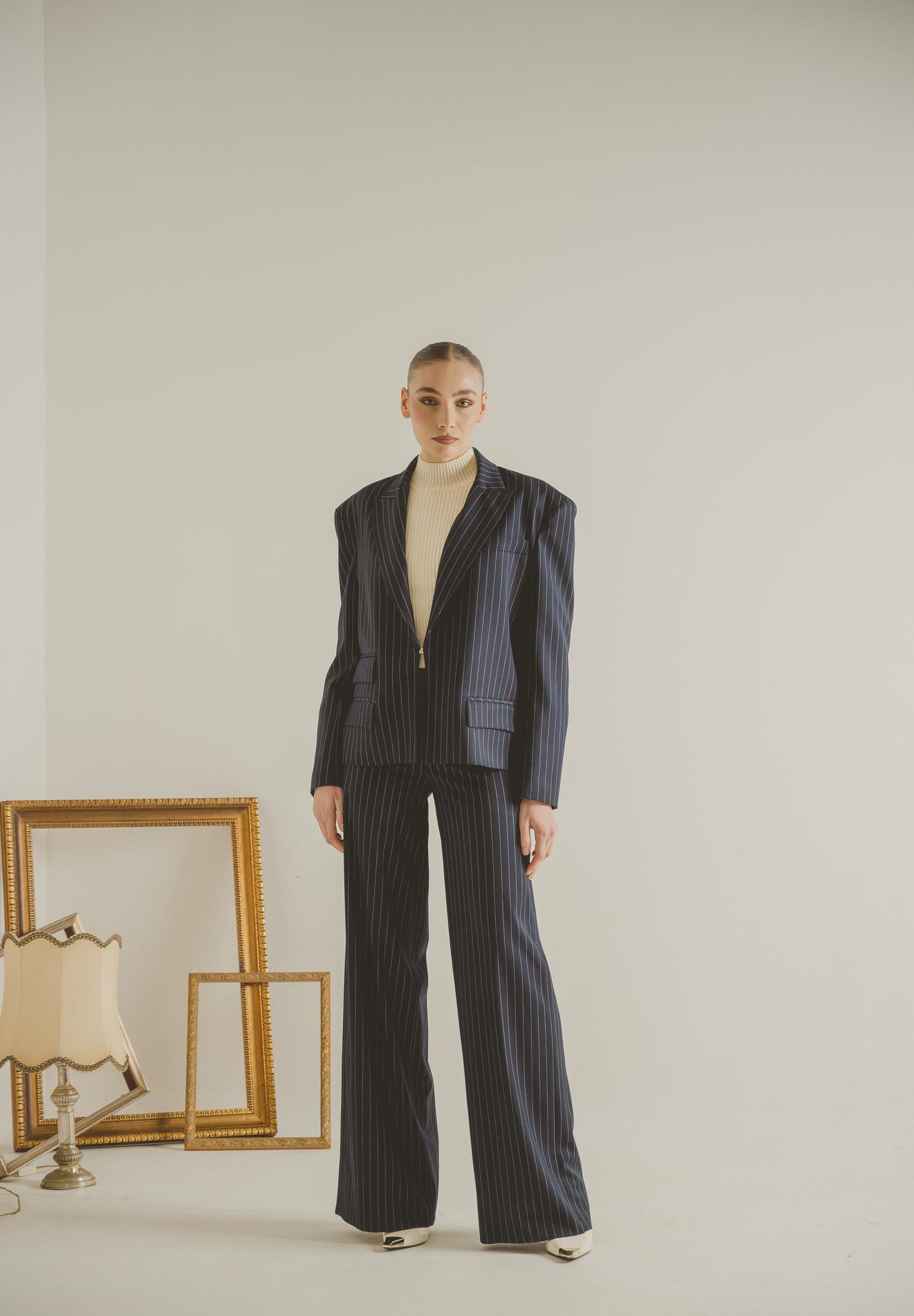 SANTAS OMBRE women's blue jacket. This modern, tailored jacket is crafted from a refined burgundy fabric with thin vertical stripes that slim the figure and add an elegant, contemporary touch. It features a notched lapel, a structured yet soft shoulder that creates a contemporary volume, and a single gold button front closure that highlights the garment with a discreet yet sophisticated detail. The flap pockets, embellished with a multi-layered construction, add character and a couture touch. The slightly oversized fit makes the jacket versatile and suitable for both formal looks and more fashionable interpretations, always maintaining a sophisticated and distinctive allure. The model wears a size 40 and is 170 cm tall. We recommend washing and ironing at medium heat. Fall/Winter season.