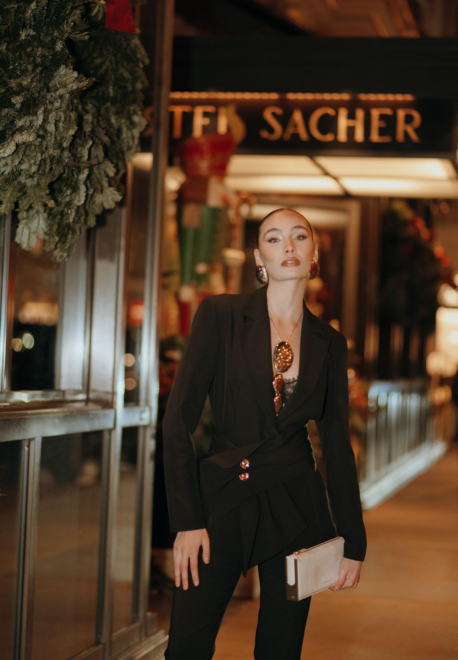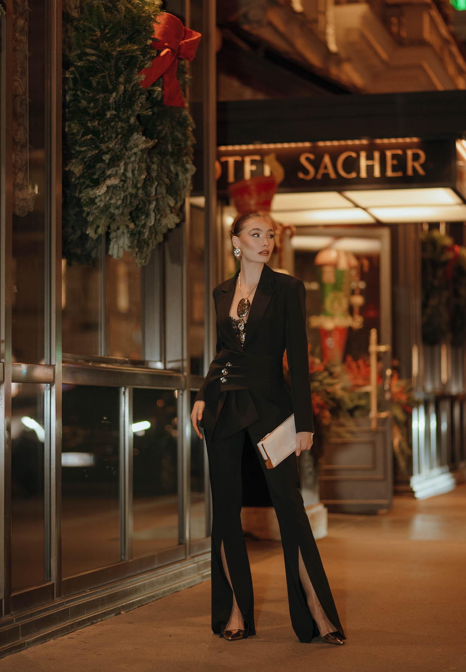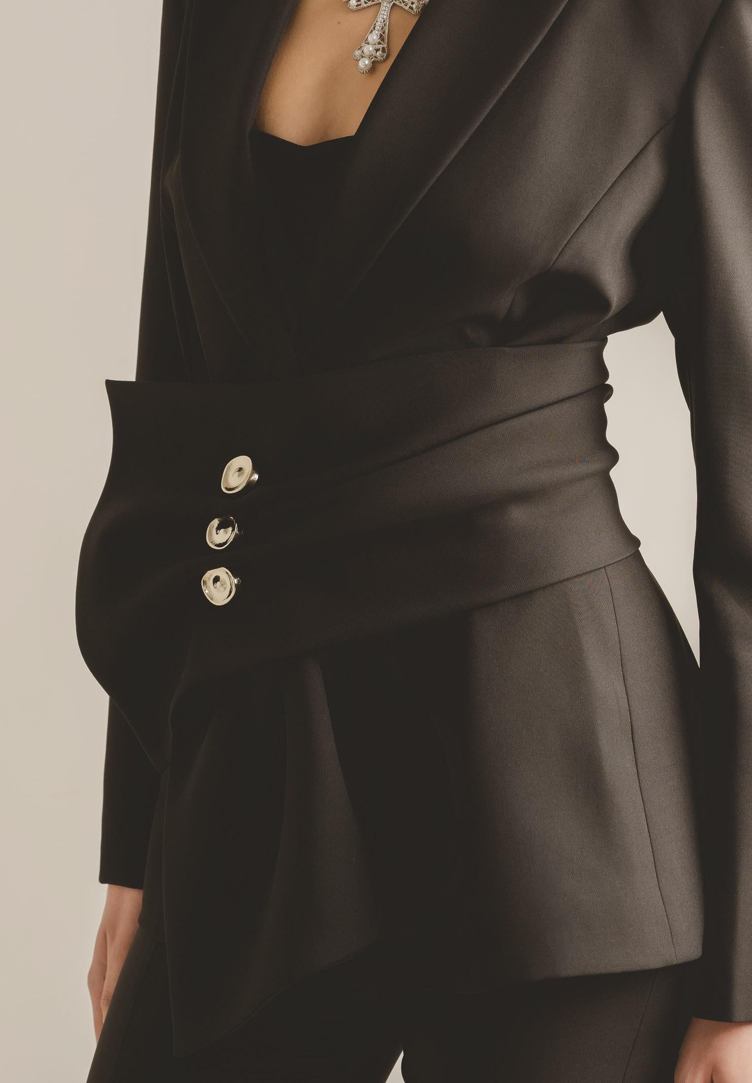 SANTAS Women's black ALLURE jacket features a clean line and a feminine fit that harmoniously follows the silhouette. It features a classic lapel, defined shoulders, and a long cut that slims the figure. The compact fabric holds its shape and creates a sophisticated look, perfect for both formal and more sophisticated outfits. A distinctive element is the waistband, embellished with three metal buttons that add a precious and sculptural detail: this band is completely removable, allowing the jacket to be transformed to suit the occasion. Worn without it, the jacket takes on a minimal and linear look; with the band, however, attention is drawn to the waist, creating a couture-like, enveloping effect. The model wears a size 40 and is 170 cm tall. We recommend washing and ironing at medium heat. Fall/Winter season.
