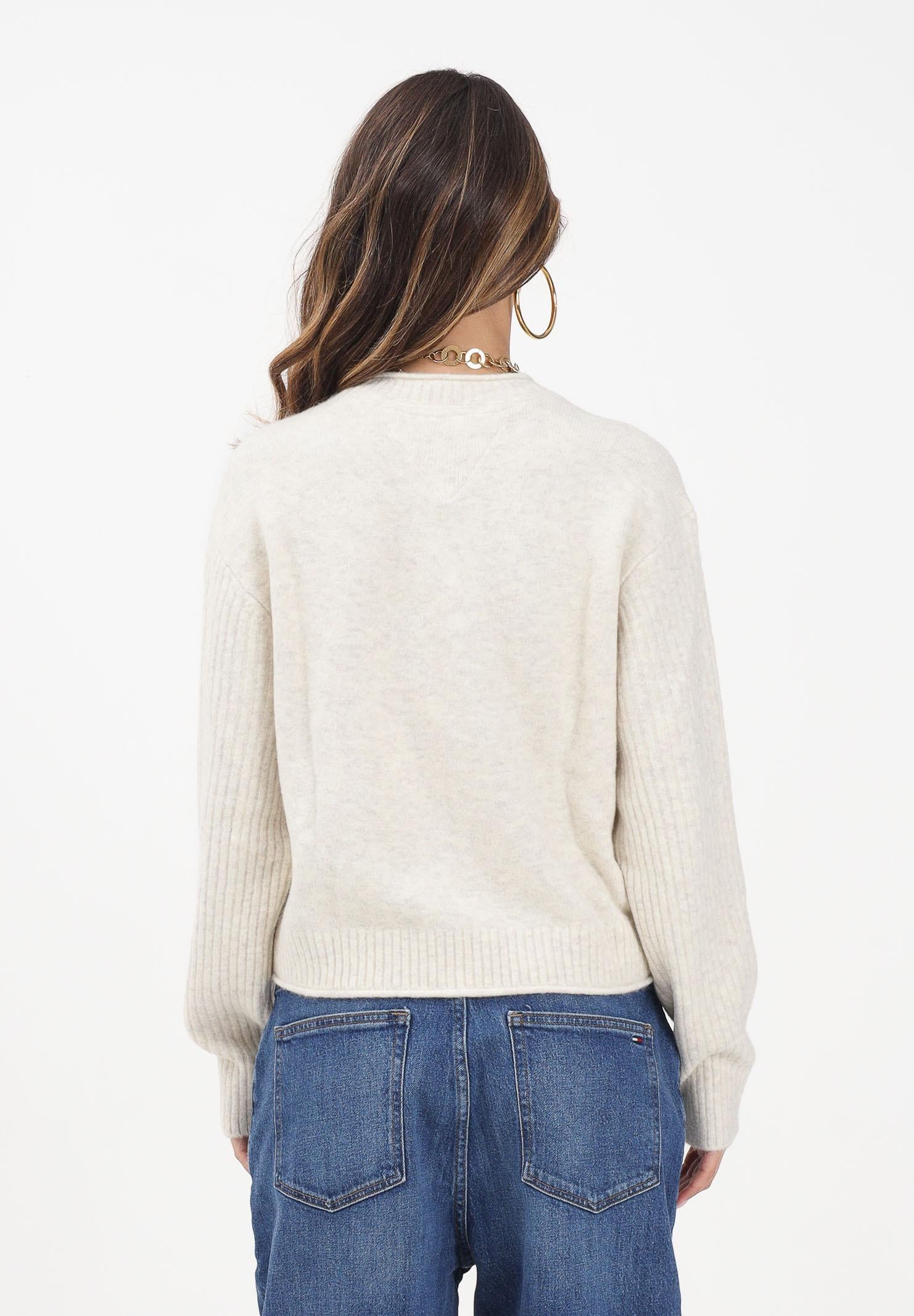 TOMMY JEANS women's cream crew neck sweater. This relaxed-fit melange sweater, featuring a brightly colored Tommy flag on the front, is a must-have for completing your casual looks. The model wears a size S and is 170 cm tall. Machine wash and iron at medium heat are recommended. Fall/Winter season.