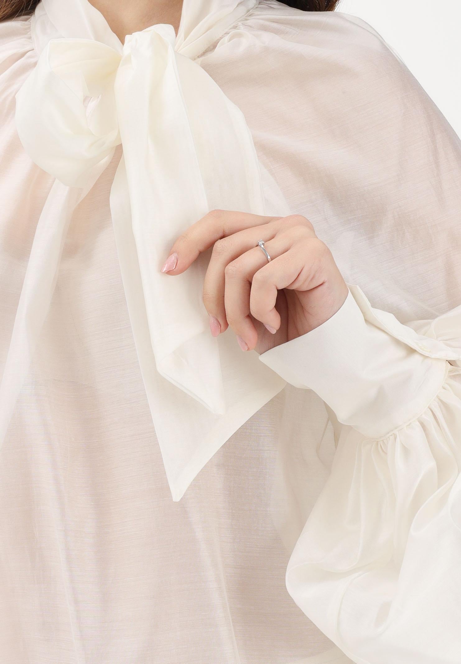 VICOLO Blusa burro da donna dalla linea morbida e raffinata, caratterizzata da un design femminile e senza tempo. Realizzata in tessuto leggero e semitrasparente, dona al capo un effetto etereo e delicato. Il modello presenta collo alto con foulard integrato da annodare a fiocco, dettaglio iconico che valorizza il décolleté con discreta eleganza. Le maniche lunghe sono ampie e fluide, rifinite con polsini strutturati che creano un raffinato gioco di volumi. Sul retro, la leggera arricciatura sotto il collo aggiunge movimento e morbidezza alla silhouette. Una blusa versatile e sofisticata, perfetta da abbinare a completi sartoriali o a pantaloni più casual per un look chic e contemporaneo. La modella indossa una taglia S ed è alta 170cm. Si consiglia un lavaggio ed una stiratura a media temperatura. Stagione primavera estate.