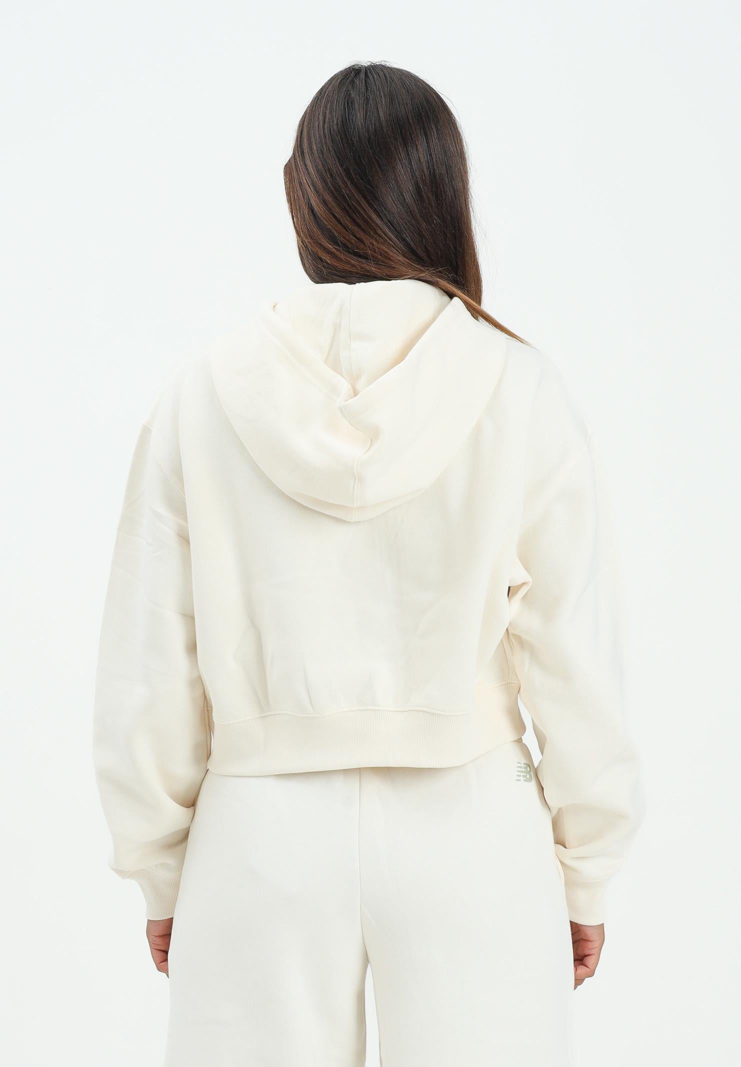 NEW BALANCE women's cream zip-up sweatshirt with fleece lining. This hoodie features a modern and comfortable design, ideal for a casual and versatile look. Made of soft cotton, it has a relaxed fit with dropped shoulders and long sleeves that end with elastic cuffs. The front zip closure makes it practical and functional, while the adjustable drawstring hood adds a sporty touch. The distinctive feature of this model is its cropped line that reveals the waistline, perfect for pairing with both track pants and high-waisted jeans. The sage green color gives it a fresh and contemporary look, embellished with a small tone-on-tone embroidered lettering on the chest. On the back, the design remains clean and simple, highlighting the attention to minimal details. An ideal garment for those seeking comfort without sacrificing style. The model is wearing a size S and is 170 cm tall. We recommend washing and ironing at medium heat.