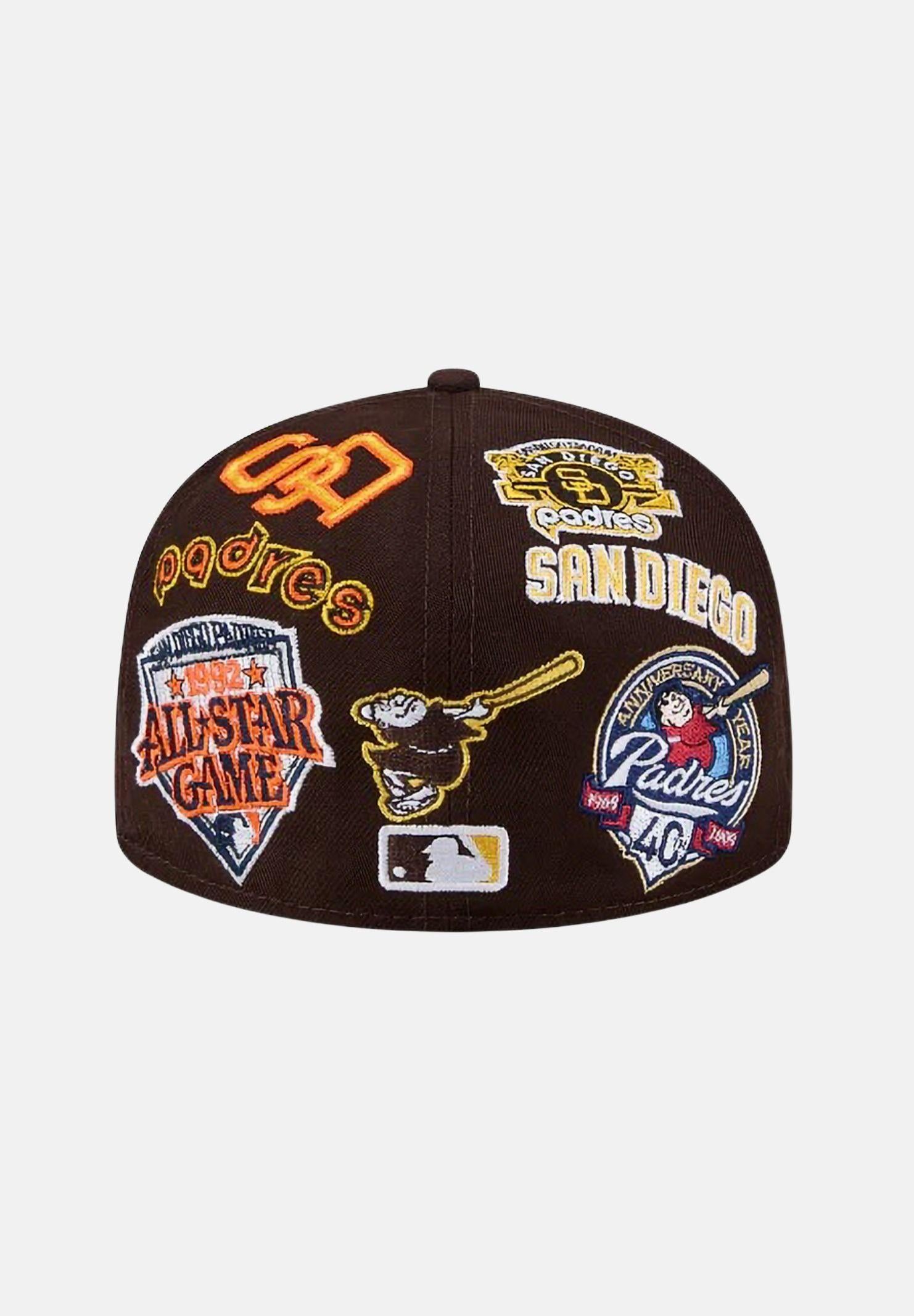 NEW ERA San Diego Padres All Over 59 FIFTY Fitted brown visor cap for men and women. The San Diego Padres All Over 59 FIFTY Fitted cap features embroidered Padres team patches throughout, with the logo on the front panels, the MLB Batterman logo on the back, and a gray undervisor. Spring Summer season.