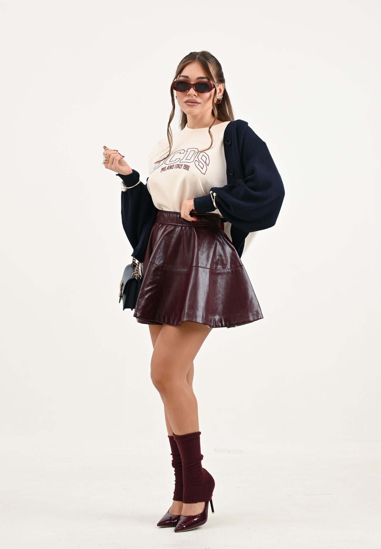GCDS women's cream short-sleeved T-shirt with an oversized fit. The piece features a central print with the words: GCDS MILANO ITALY 1988 in large burgundy lettering, in a college-style look. The crew neck has a clean finish, while the back is plain, without prints or appliques. The model wears a size S and is 170 cm tall. Machine wash and iron at medium heat. Fall/Winter season.