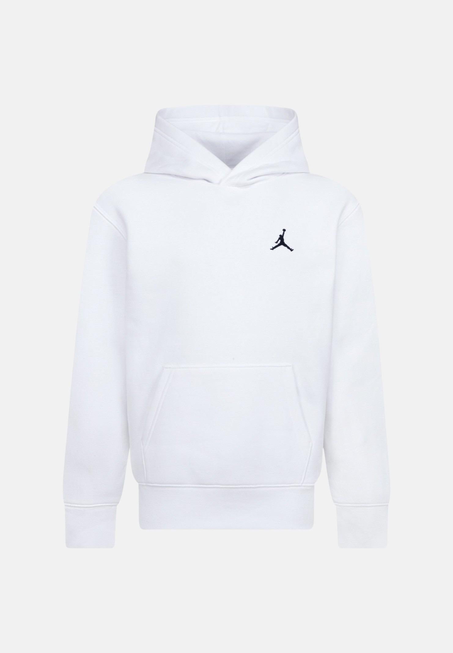 JORDAN Brooklyn hoodie in white for boys and girls. The white Jumpman logo embroidered on the chest adds an iconic touch. Made of soft cotton blend, it offers comfort and warmth ideal for a sporty and casual look. The design includes a wraparound hood and a practical kangaroo pocket for a functional and trendy touch. Perfect for those who love streetwear style with a nod to basketball heritage. We recommend washing and ironing at medium temperature. Spring summer season.