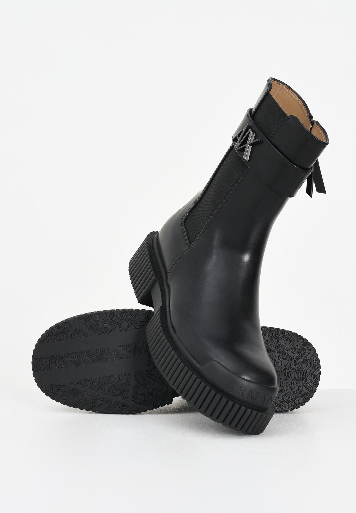 ARMANI EXCHANGE Stivali bassi neri da donna. Questo stivale firmato Armani Exchange rappresenta una perfetta combinazione di stile urbano e funzionalità. Realizzato in ecopelle, ha una silhouette pulita e minimalista che lo rende estremamente versatile, ideale da indossare sia con outfit casual che più sofisticati. Il design è valorizzato da una suola carrarmato in gomma, alta e scolpita, che dona un tocco grintoso e contemporaneo, oltre a garantire comfort e aderenza. Sul lato esterno è presente un inserto elastico che facilita la calzata, mentre la fascetta in tono presenta l'iconico logo AX in metallo, applicato con eleganza sopra la caviglia. Lo stivale è privo di chiusura con zip, mantenendo una linea essenziale e moderna, perfetta per chi cerca uno stile deciso ma pratico. Comodo, resistente e attuale, è un accessorio ideale per affrontare con stile la stagione autunno/inverno. Stagione autunno inverno.