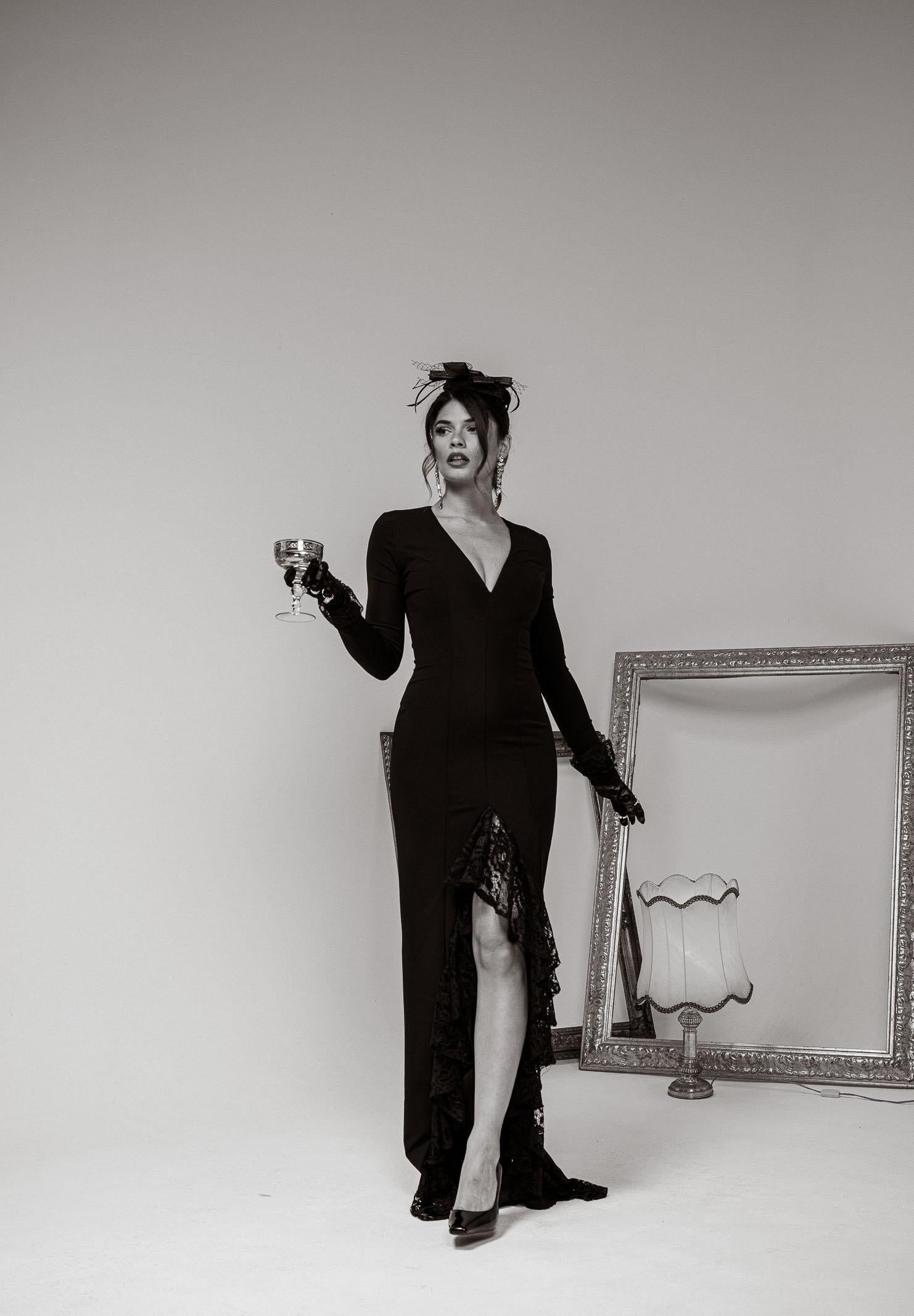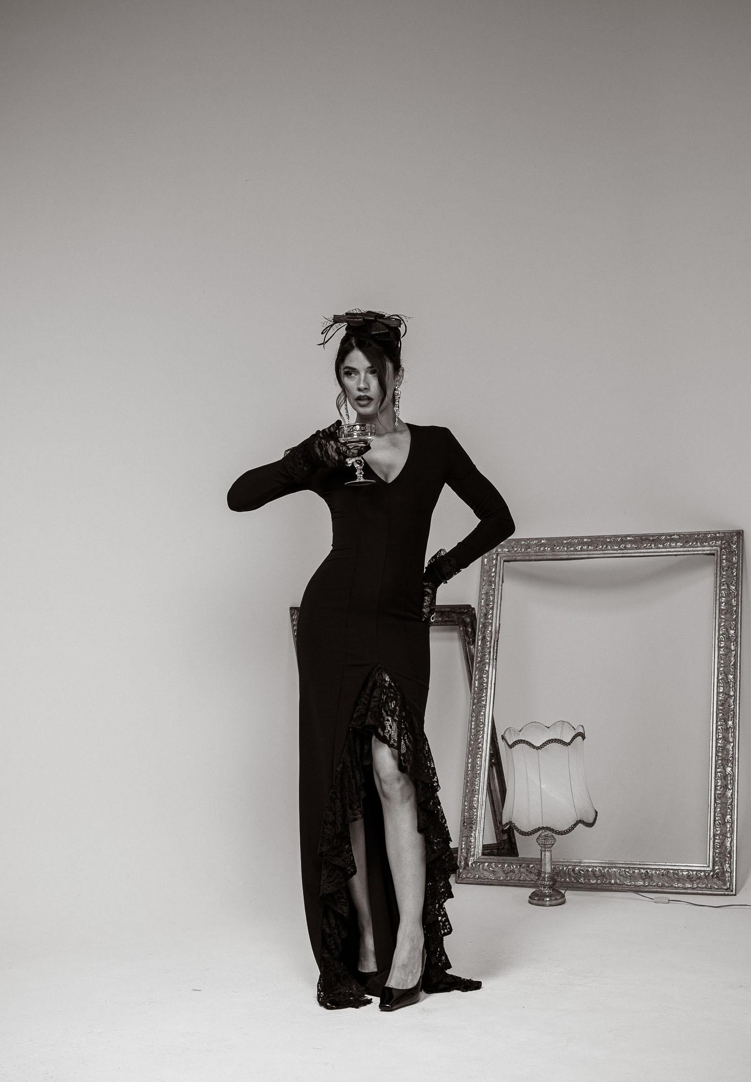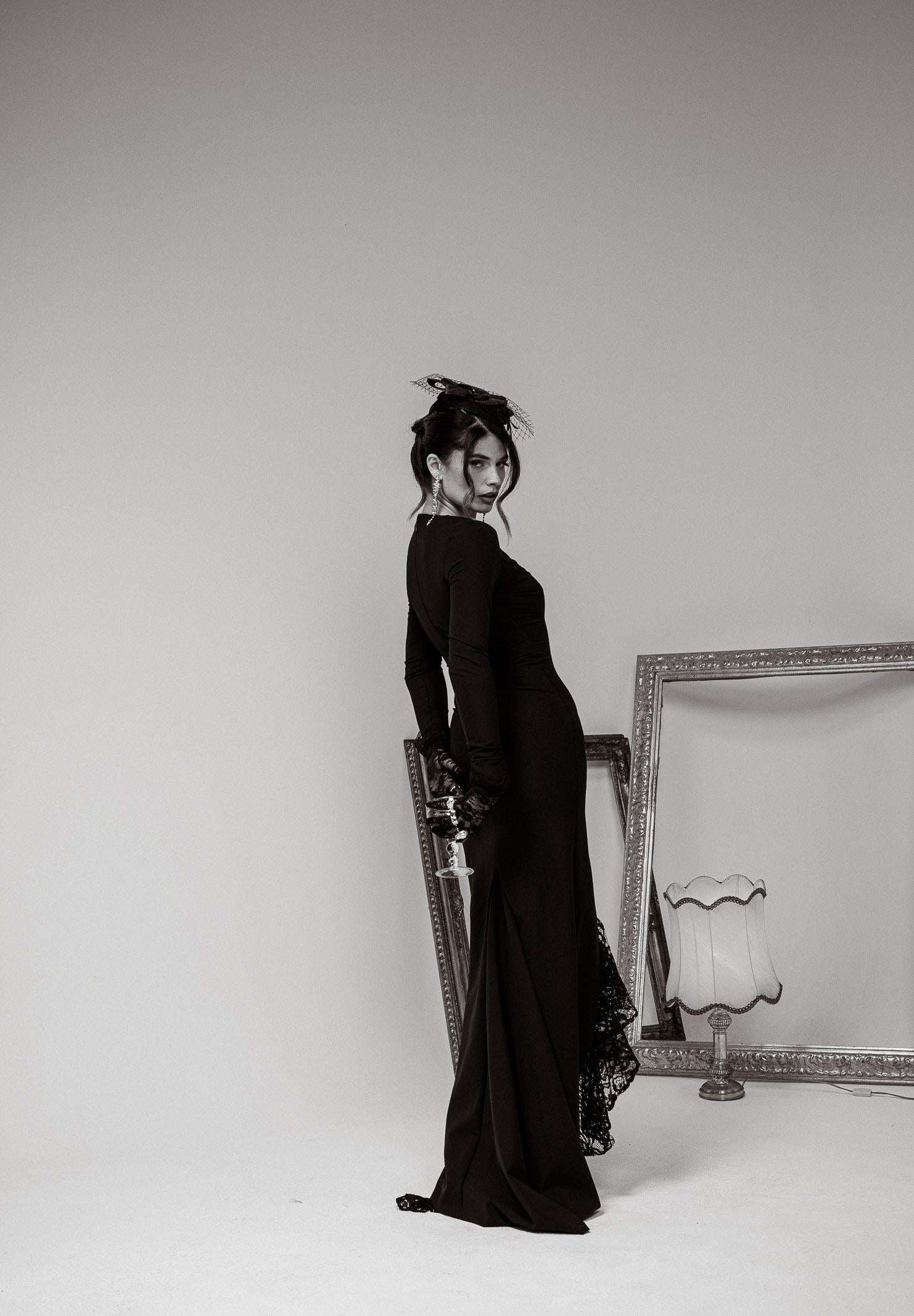 SANTAS Abito lungo ENCHANTÉE nero da donna. Realizzato in un tessuto liscio, questo abito lungo avvolge la silhouette con una linea a sirena che esalta le forme in modo raffinato. La scollatura a V allunga la figura e dona un tocco femminile discreto, mentre le maniche lunghe aderenti bilanciano l'insieme con sobrietà e classe. L'elemento distintivo è lo spacco adornato da una balza in pizzo, che si apre in un elegante gioco di trasparenze, rivelando la gamba con grazia e movimento. Il pizzo, delicato e romantico, aggiunge un contrasto di texture che impreziosisce il design, rendendolo ideale per eventi serali, cerimonie o occasioni speciali. La parte posteriore presenta una linea pulita e slanciata, con una leggera coda che sfiora il pavimento, amplificando l'effetto di eleganza. La modella indossa una taglia 40 ed è alta 170cm. Si consiglia un lavaggio ed una stiratura a media temperatura. Stagione autunno inverno.