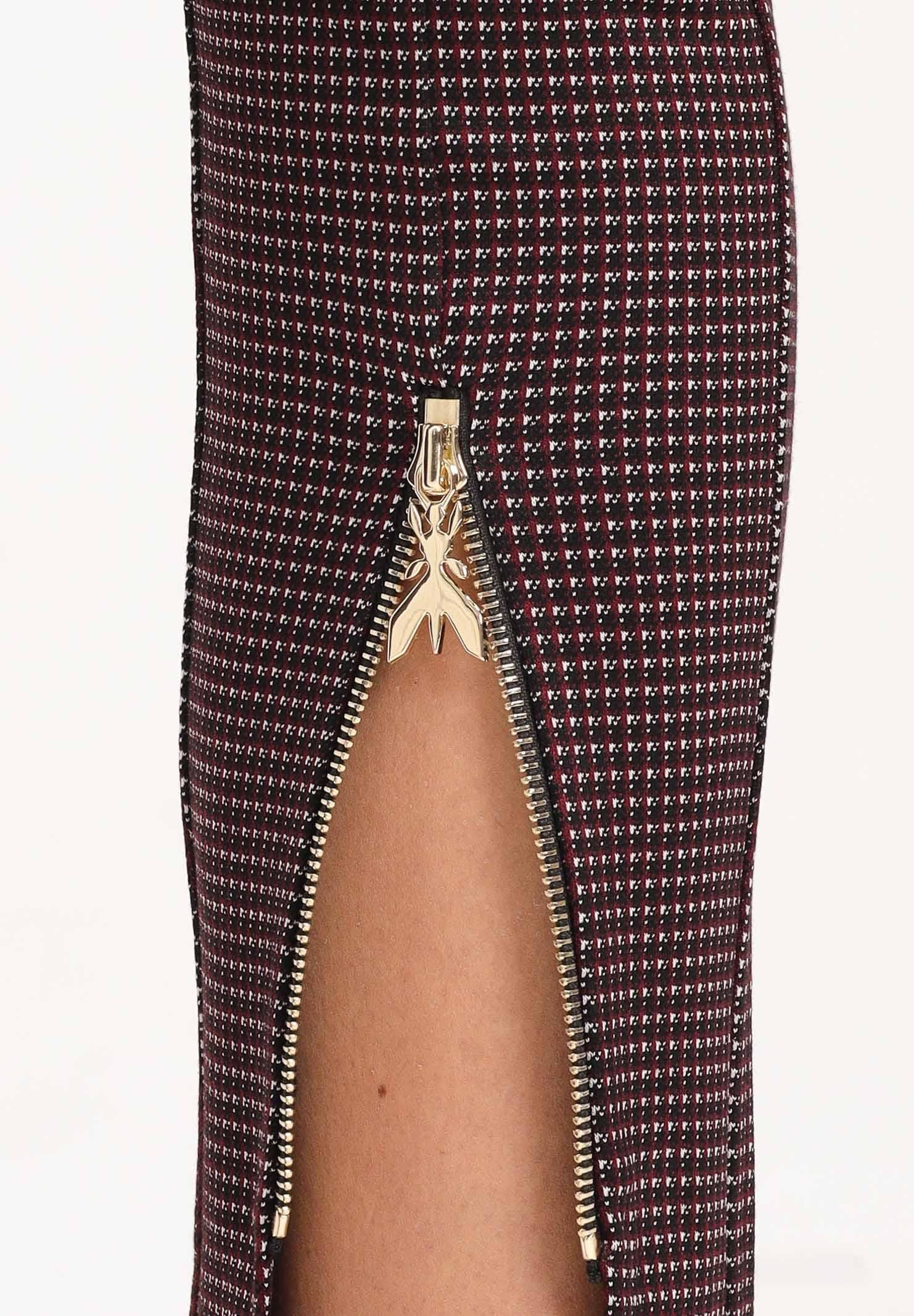 PATRIZIA PEPE Pantalone elegante bordeaux da donna realizzato in tessuto elasticizzato a microfantasia nei toni del bordeaux, nero e bianco. La vita è regolare e sagomata, per una vestibilità confortevole e impeccabile. Sul retro è presente un piccolo logo discreto applicato sul punto vita. Il fondo gamba è impreziosito da zip dorate con tirazip decorativo, che permettono di regolare l'apertura e aggiungono un tocco moderno e ricercato. La lunghezza alla caviglia e il taglio pulito rendono questo pantalone perfetto sia per look casual chic con maglioni o camicie, sia per outfit più eleganti abbinato a tacchi e blazer coordinato. La modella indossa una taglia 40 ed è alta 170cm. Si consiglia un lavaggio ed una stiratura a media temperatura. Stagione autunno inverno.