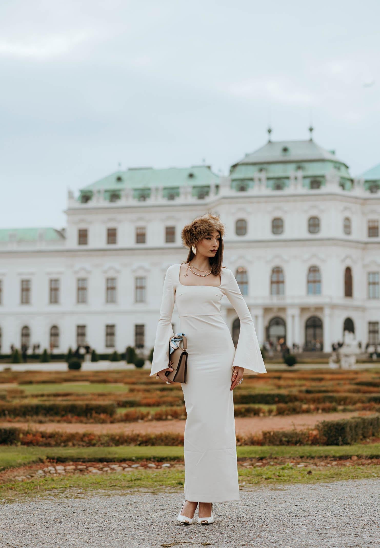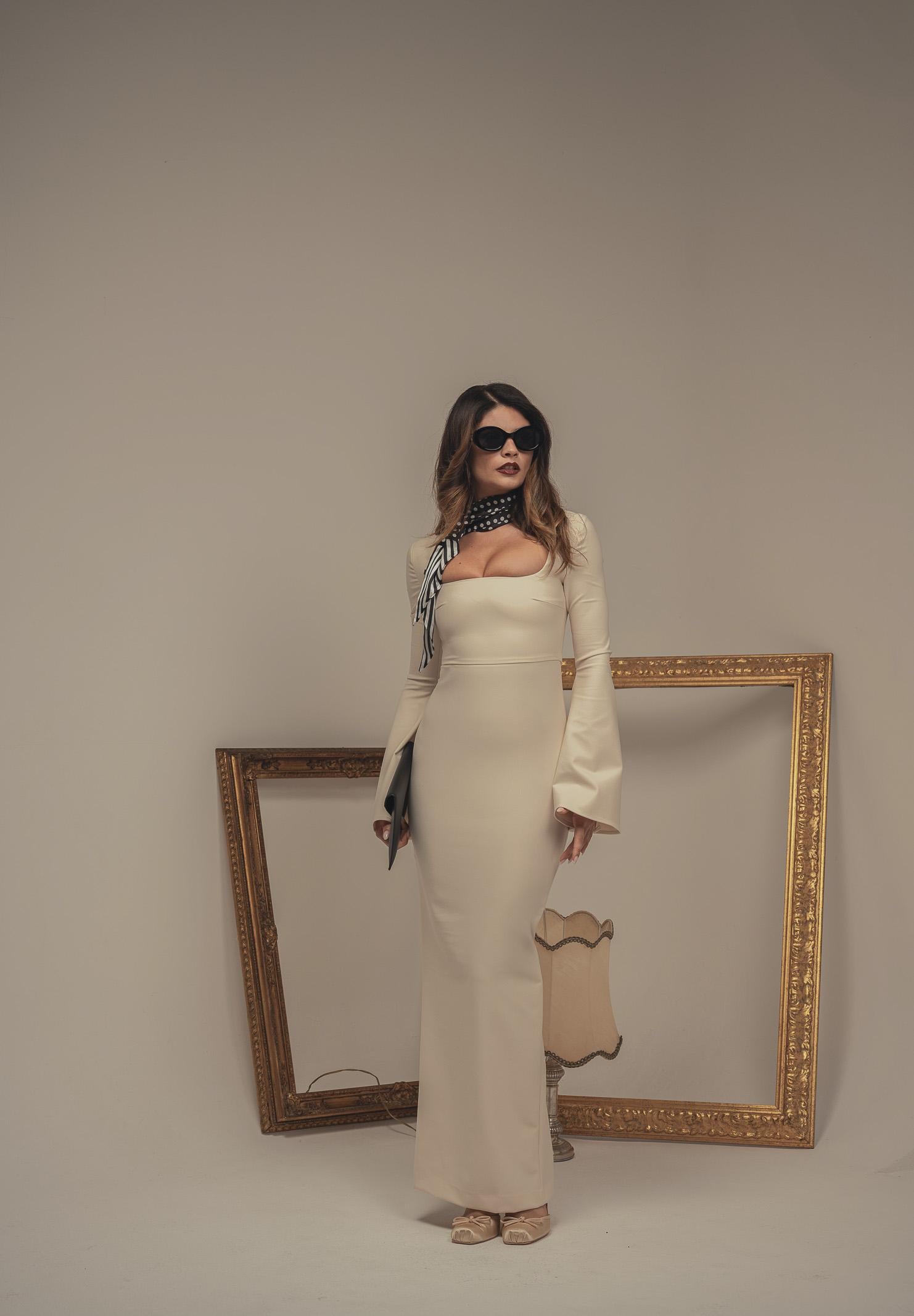 SANTAS Abito lungo LUMIÈRE panna da donna. L'abito si distingue per la sua eleganza essenziale e la linea estremamente femminile. Realizzato in un tessuto liscio e leggermente elasticizzato, avvolge la figura con una vestibilità aderente che valorizza la silhouette. Il corpetto presenta un raffinato scollo quadrato, che incornicia il décolleté con discrezione e classe. Le maniche lunghe si aprono in un ampio taglio a campana, dettaglio che dona movimento e un tocco di teatralità al capo. La lunghezza del vestito arriva alla caviglia, conferendo un'eleganza sobria e sofisticata. Chiusura posteriore con zip invisibile. Abbinato a décolleté nere e collier dorato, questo abito rappresenta la scelta perfetta per serate formali o eventi speciali, dove si desidera un look senza tempo ma d'impatto. La modella indossa una taglia 40 ed è alta 170cm. Si consiglia un lavaggio ed una stiratura a media temperatura. Stagione autunno inverno.