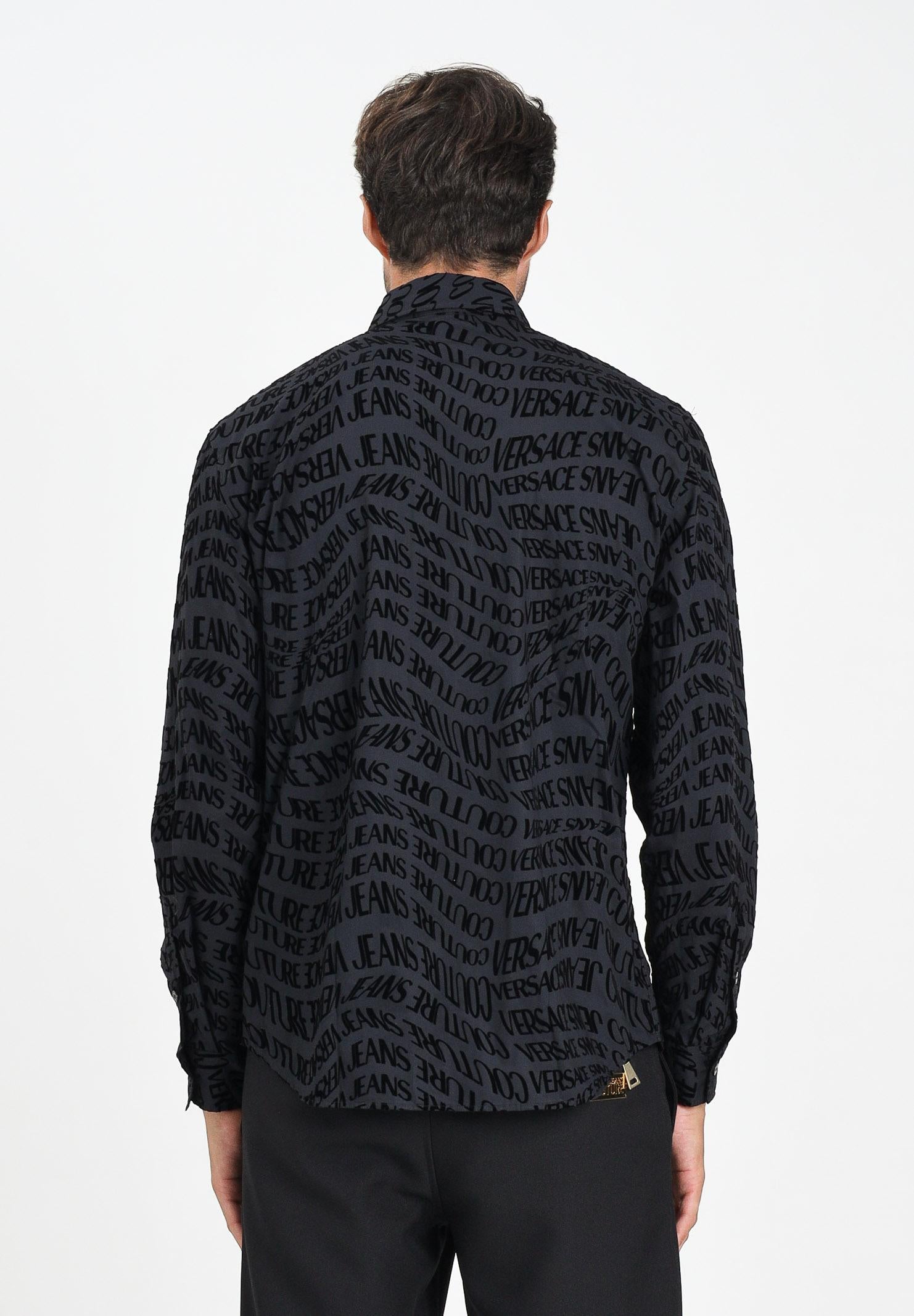 VERSACE JEANS COUTURE Camicia a manica lunga nera da uomo con motivo Liquify Logomania vellutato