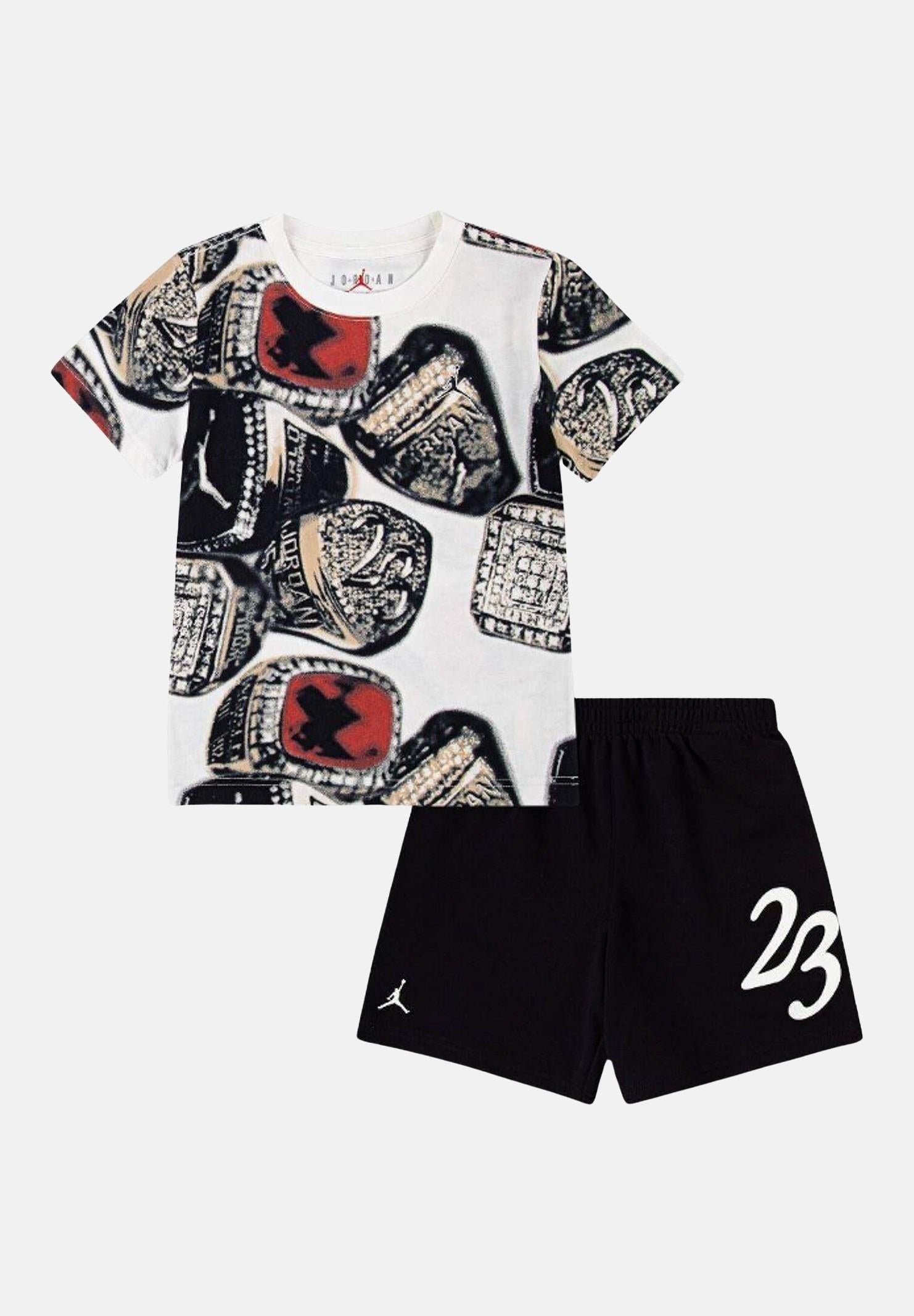 JORDAN Completino MVP Ring bianco e nero per bambino e bambina. Questo set Jordan unisce comfort e stile sportivo in un design iconico. La t-shirt a maniche corte presenta una stampa all-over con anelli da campione, un omaggio alla leggenda di Michael Jordan. Gli shorts neri, dal taglio comodo, sono decorati con il numero 23 sul lato, simbolo inconfondibile della dinastia Jordan. Si consiglia un lavaggio ed una stiratura a media temperatura. Stagione primavera estate.
