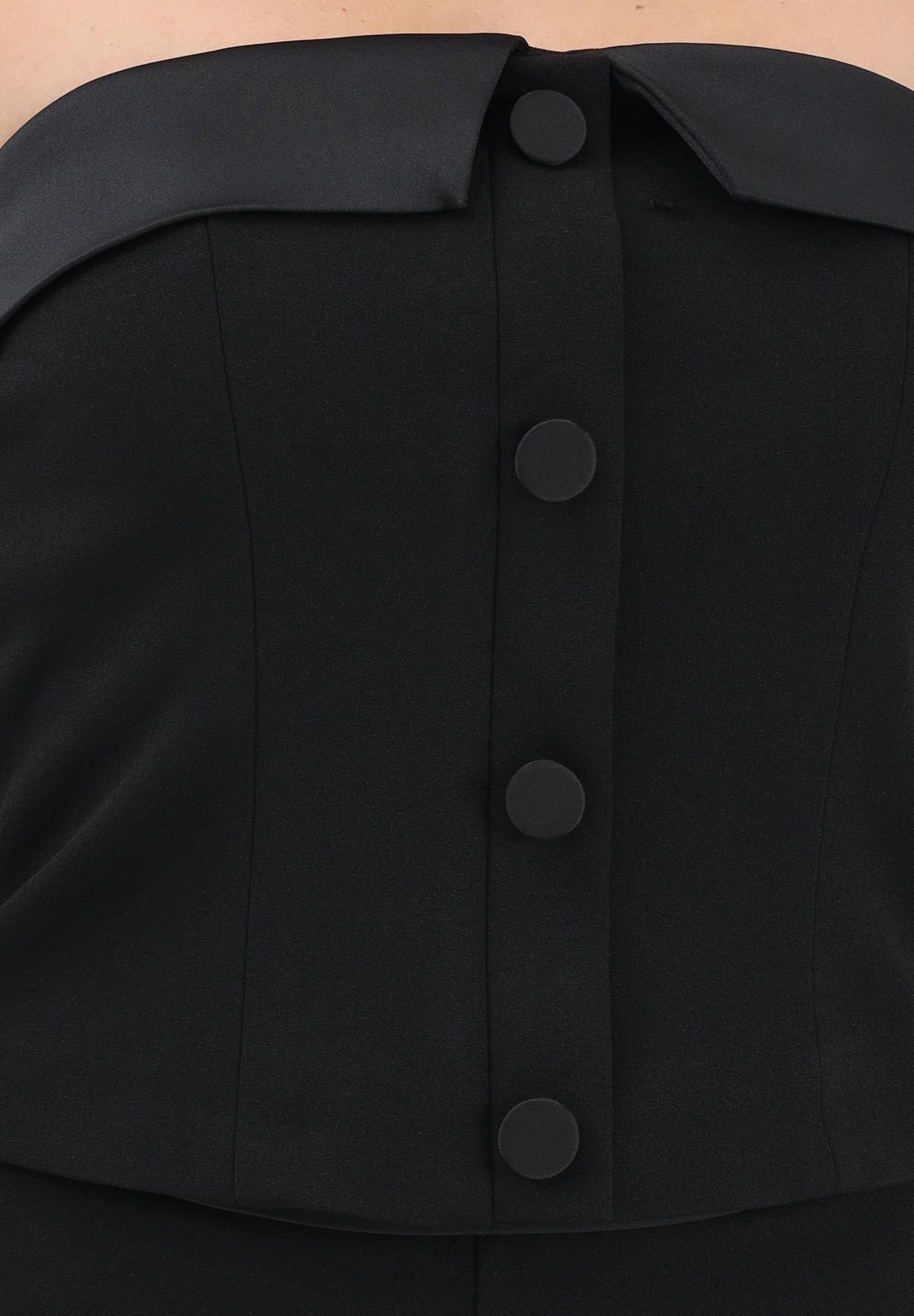 VICOLO Top bustier nero da donna dal design essenziale e sofisticato, perfetto per look eleganti e contemporanei. Il modello è senza spalline, con scollatura dritta che valorizza il décolleté e dona una linea pulita e femminile. La chiusura frontale con bottoni rivestiti aggiunge un dettaglio sartoriale raffinato, mentre le impunture verticali definiscono la silhouette assicurando una vestibilità strutturata e confortevole. Il fondo dritto permette un abbinamento armonioso sia con pantaloni coordinati che con gonne a vita alta. Un capo versatile e chic, ideale da indossare da solo o sotto una giacca per un outfit da sera o da occasione speciale. La modella indossa una taglia S ed è alta 170cm. Si consiglia un lavaggio ed una stiratura a media temperatura. Stagione primavera estate.