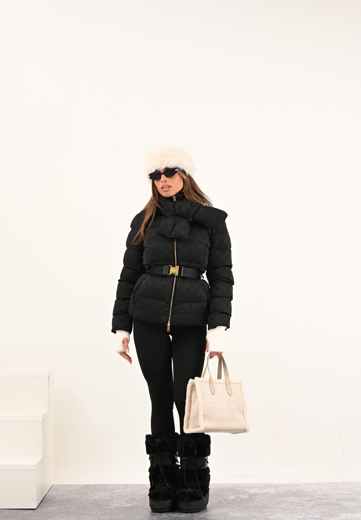 ELISABETTA FRANCHI Piumino nero da donna in tessuto vela jacquard con cintura