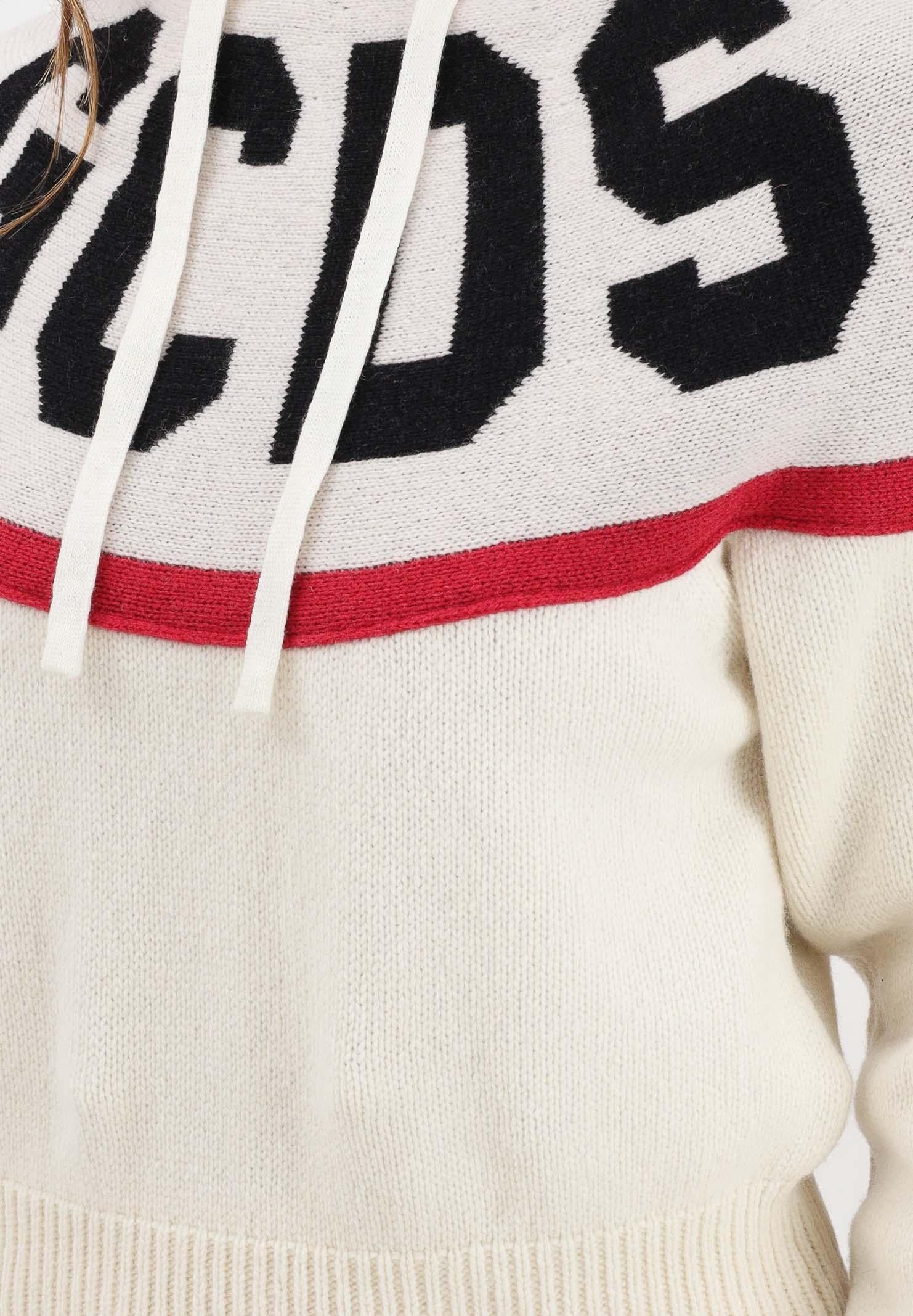 GCDS Maglia con cappuccio panna da donna caratterizzata da maxi logo GCDS a intarsio sul petto. Linea dritta con spalle scese e fondo rifinito a costine. La modella indossa una taglia S ed è alta 170cm. Si consiglia un lavaggio ed una stiratura a media temperatura. Stagione autunno inverno.