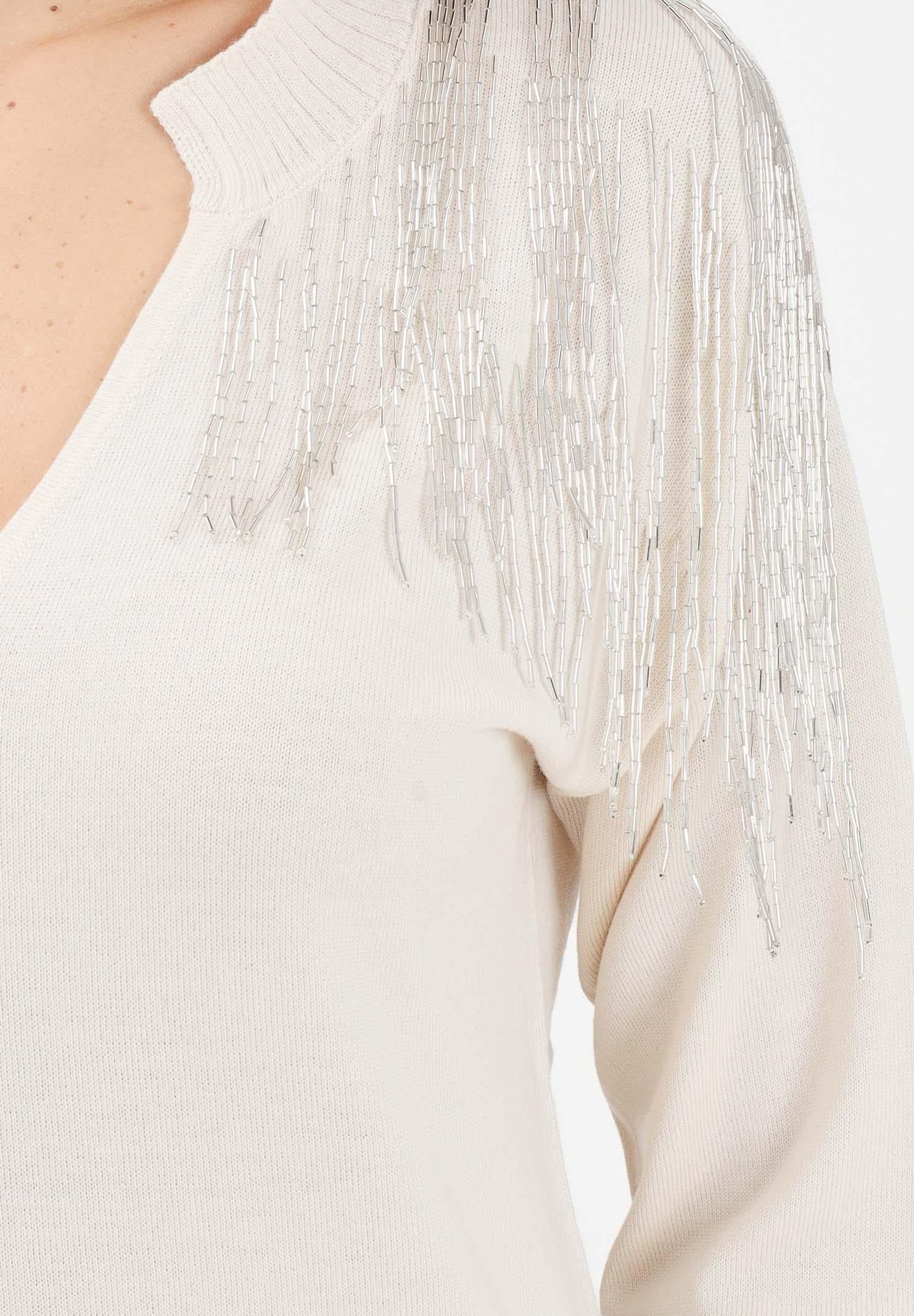 PATRIZIA PEPE Maglioncino scollo a v panna da donna con strass sulle spalle
