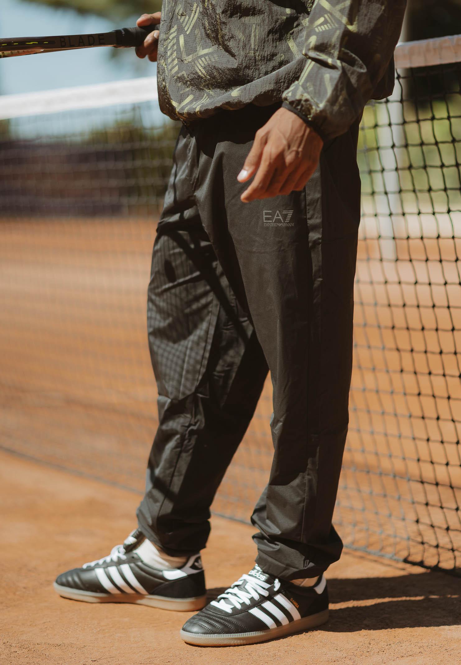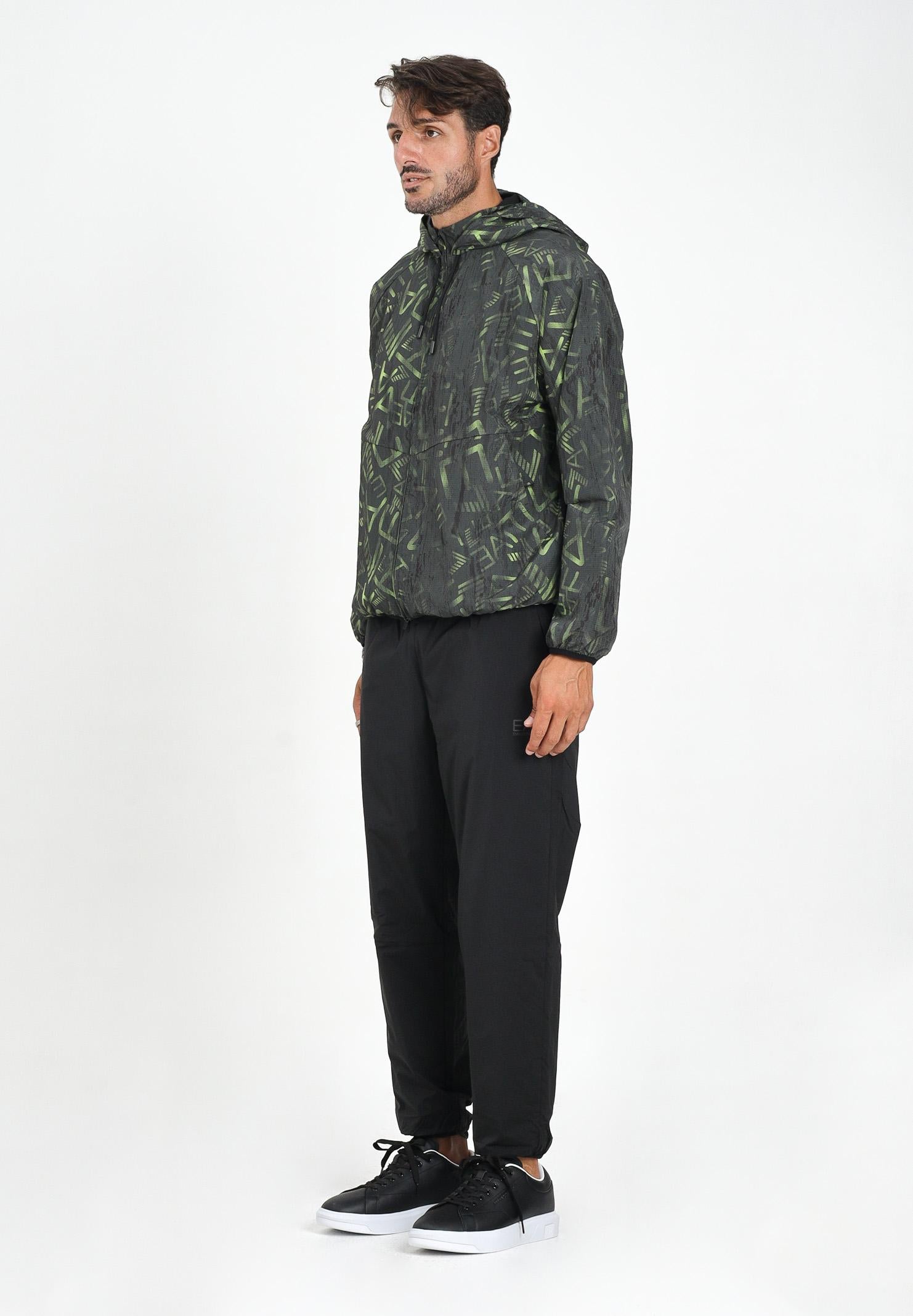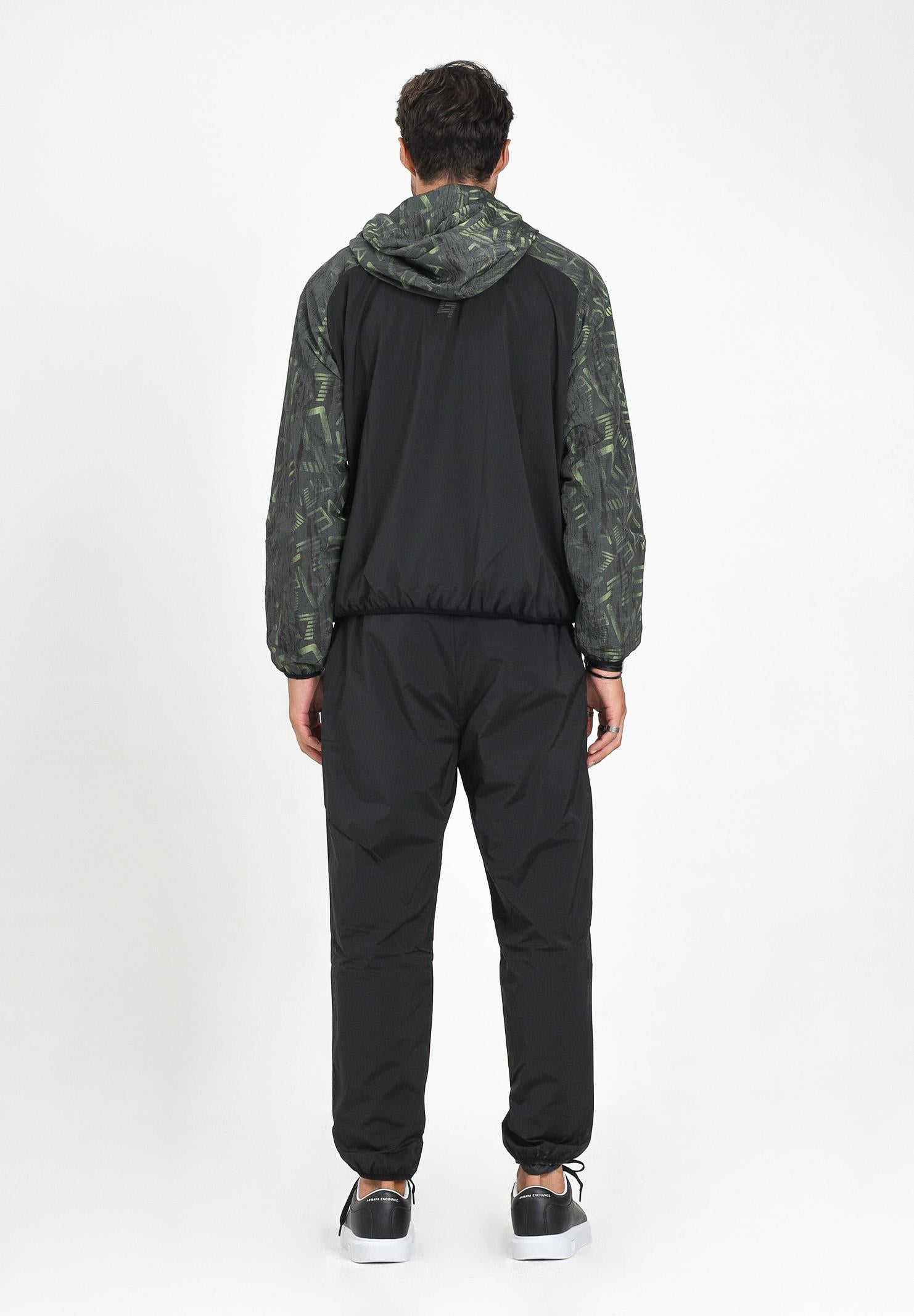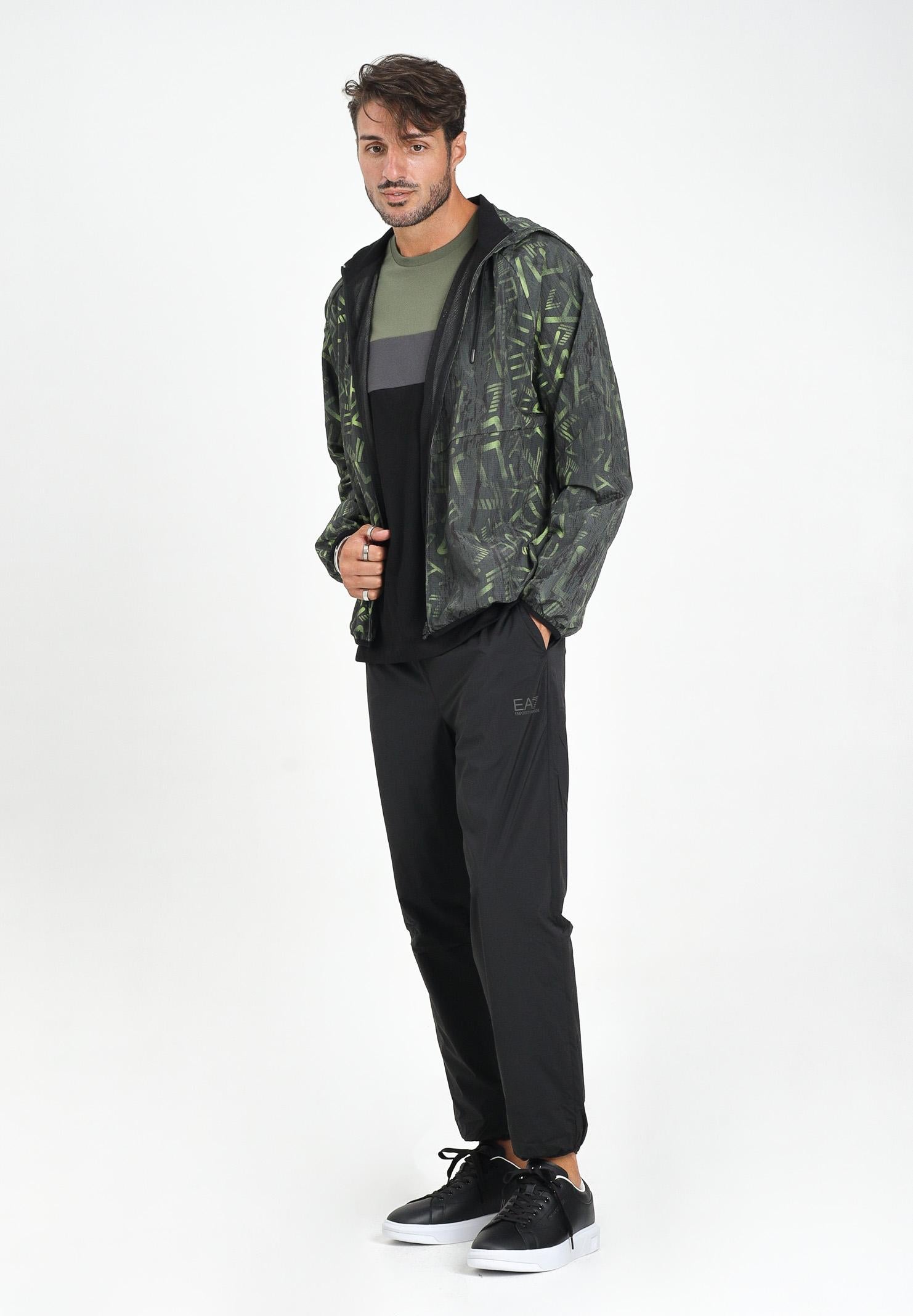 EA7 Tuta nera da uomo. Questa tuta ha un look sportivo e grintoso, perfetto per il tempo libero o per attività outdoor. Il completo è composto da giacca con cappuccio e pantaloni coordinati, entrambi in tessuto tecnico leggero, ideale per la mezza stagione. La giacca presenta una stampa logo all over nei toni del verde, con chiusura frontale a zip e cappuccio regolabile. Le maniche raglan e il fondo elasticizzato garantiscono libertà di movimento e comfort. I pantaloni, in tinta unita nera, hanno una linea dritta con elastico alla caviglia e vita regolabile. Il logo discreto sulla gamba completa il design. Un outfit dinamico e funzionale, pensato per chi ama vestire comodo senza rinunciare allo stile. Il modello indossa una taglia L ed è alto 190cm. Si consiglia un lavaggio a media temperatura. Stagione autunno inverno.