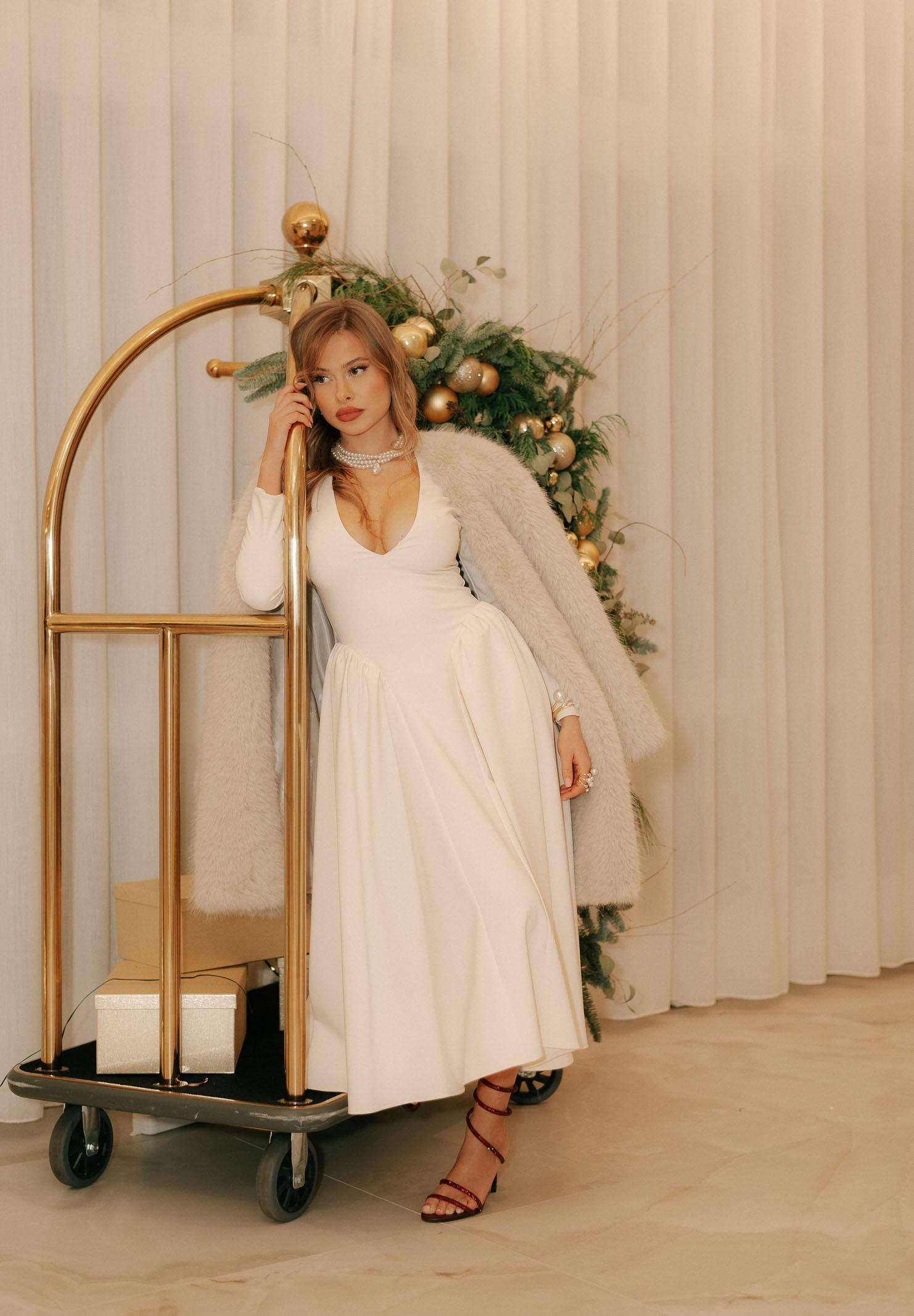 SANTAS Abito midi DOUCEUR avorio da donna. La scollatura profonda a V valorizza il décolleté, mentre la vita segnata esalta la silhouette. Le maniche lunghe strutturate con spalle leggermente accentuate aggiungono equilibrio e carattere al design, conferendo un'allure ispirata agli anni '50. La gonna ampia e morbida cade con eleganza fino al polpaccio, donando movimento e grazia ad ogni passo. Il tessuto, luminoso e consistente, accompagna il corpo senza costringerlo, rendendo l'abito perfetto sia per eventi diurni che per serate raffinate. La modella indossa una taglia 40 ed è alta 170cm. Si consiglia un lavaggio ed una stiratura a media temperatura. Stagione autunno inverno.