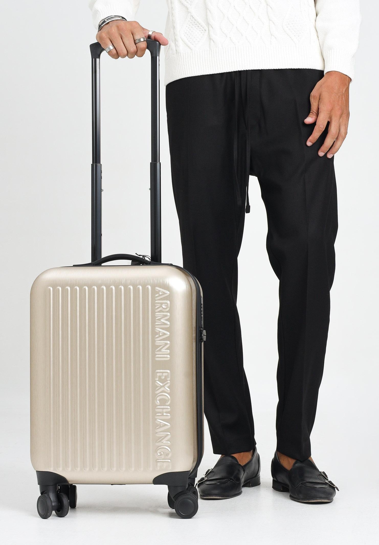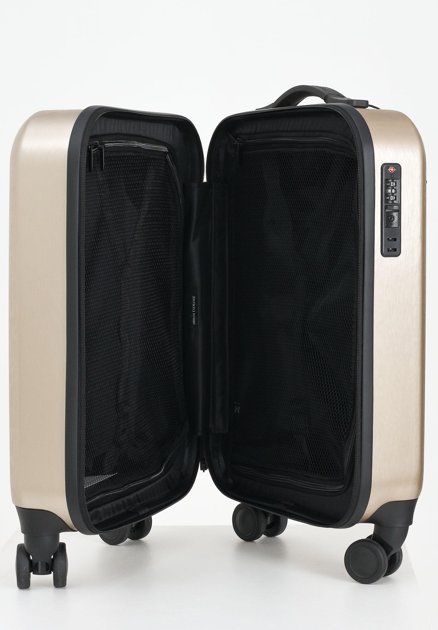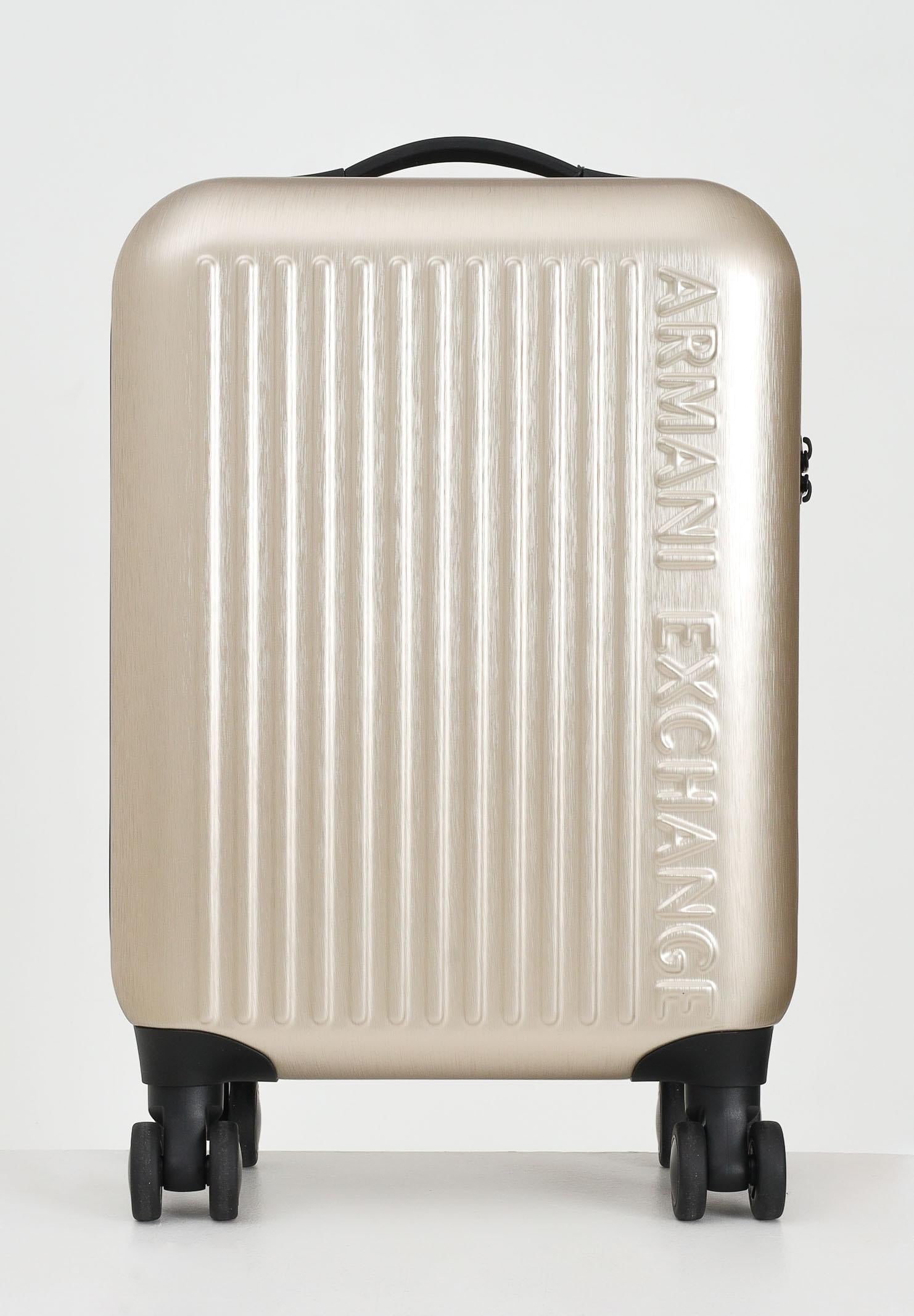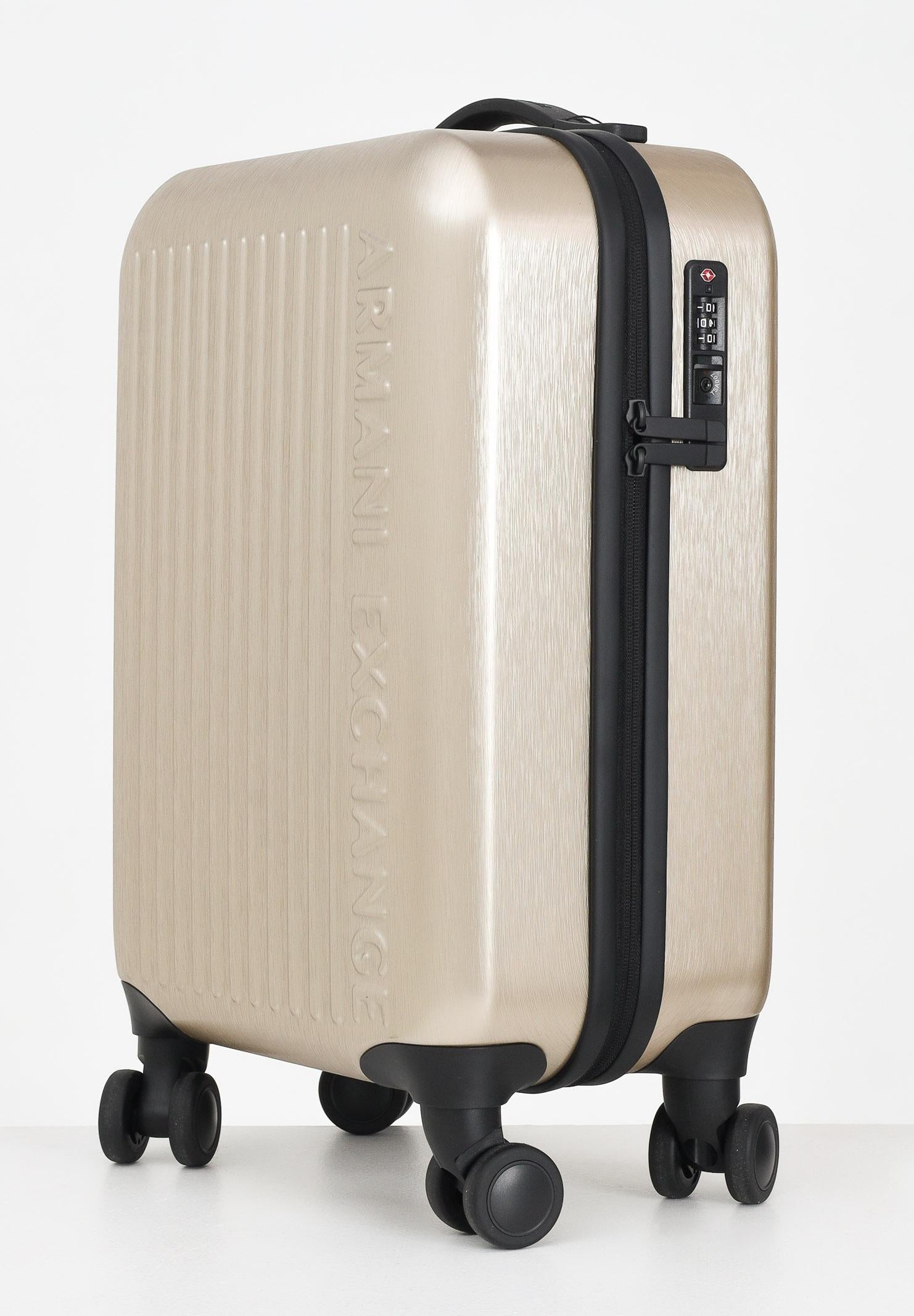 ARMANI EXCHANGE Trolley oro da donna. Questa valigia trolley firmata Armani Exchange si distingue per il suo design moderno e raffinato, caratterizzato da una scocca rigida con finitura effetto spazzolato in un elegante colore champagne. Le linee verticali in rilievo sul fronte, abbinate al logo Armani Exchange inciso in verticale, conferiscono un aspetto contemporaneo e distintivo. È dotata di quattro ruote doppie pivotanti che garantiscono una mobilità fluida e silenziosa in tutte le direzioni, ideale per spostamenti in aeroporto o in città. Il manico superiore fisso, comodo ed ergonomico, consente di sollevarla facilmente, mentre il manico telescopico regolabile permette di trascinarla con il massimo comfort. La chiusura avviene tramite una zip robusta e scorrevole, affiancata da un lucchetto con combinazione TSA integrato, perfetto per viaggiare in sicurezza anche verso destinazioni internazionali. All'interno, la valigia è organizzata in modo funzionale, con cinghie elastiche incrociate per mantenere gli abiti fermi e in ordine durante il trasporto. Essenziale e sofisticata, è la scelta ideale per chi cerca praticità senza rinunciare allo stile. Dimensioni: altezza 50cm, lunghezza 40cm, ampiezza 20cm. Stagione autunno inverno.