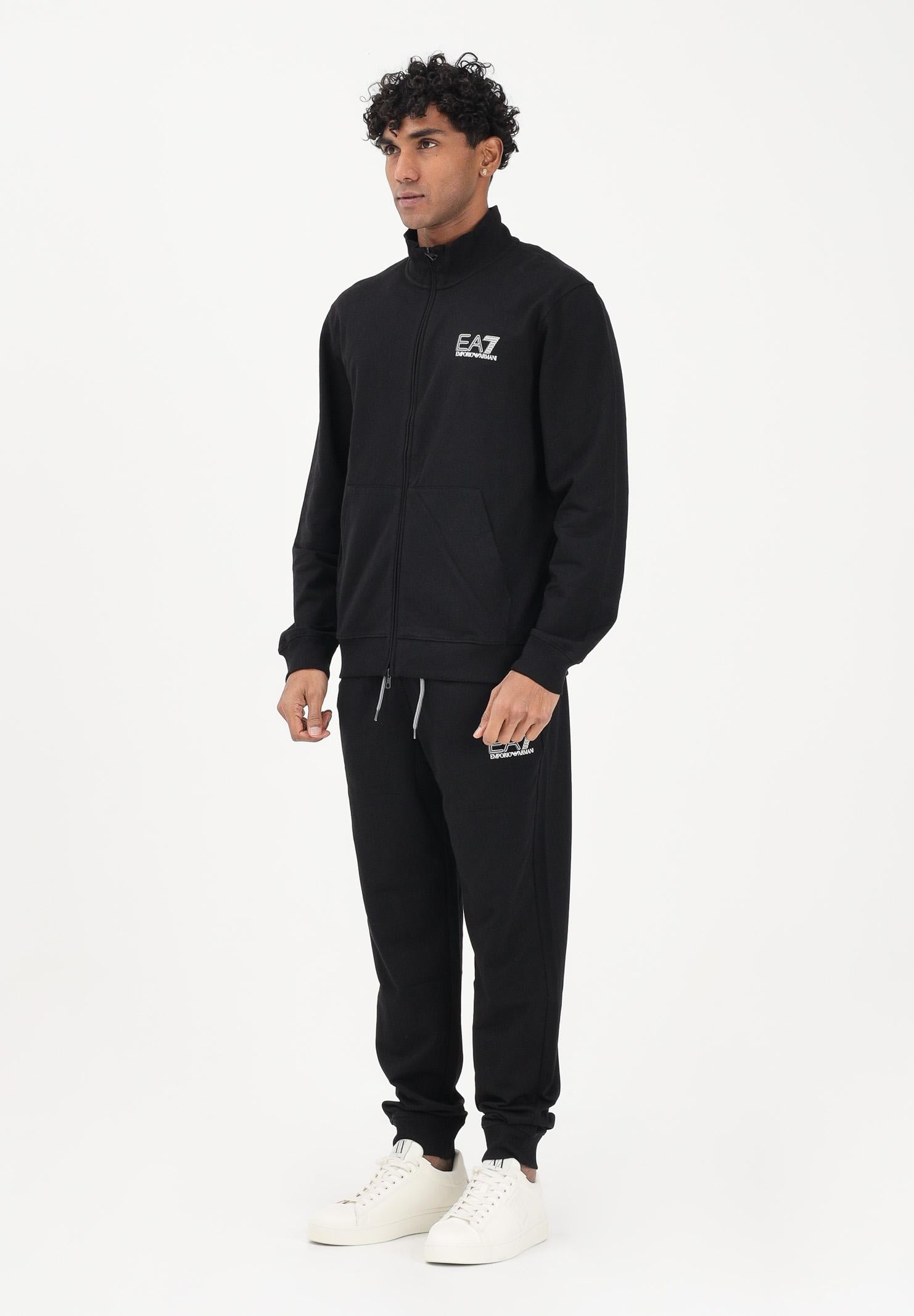 EA7 Tuta Train Visibility VI nera da uomo realizzata in tessuto di cotone garzato stretch, pensata per offrire comfort, praticità e uno stile sportivo contemporaneo. Il modello presenta una vestibilità regular fit ed è composto da giacca e pantalone coordinati. La giacca a manica lunga è caratterizzata da collo a imbuto, polsini e fondo in maglia a cannolè, con chiusura full zip a doppio cursore nascosta che garantisce un look pulito e funzionale. Il design è arricchito dal monogramma EA7 in stampa gommata in versione mini sul petto e maxi sulla schiena, oltre a un pratico tascone frontale a marsupio. Il pantalone è dotato di vita elasticizzata con coulisse regolabile tramite cordino, tasche a filo e polsini in maglia, completato da un piccolo logo EA7 stampato gommato a contrasto. Una tuta ideale per il tempo libero e l'allenamento leggero, che unisce comfort, qualità dei materiali e un'estetica sportiva distintiva. Il modello indossa una taglia L ed è alto 187cm. Si consiglia un lavaggio ed una stiratura a media temperatura. Stagione primavera estate.