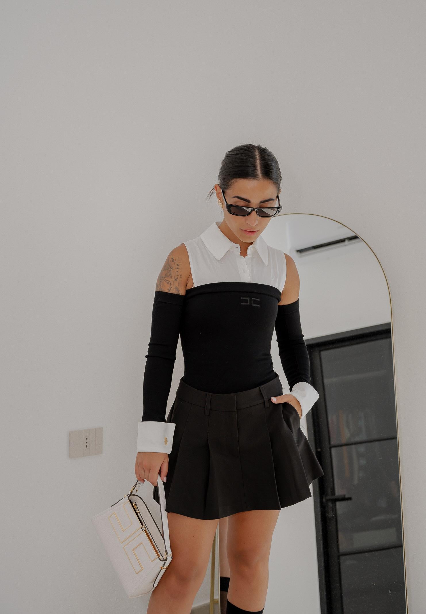 ELISABETTA FRANCHI Body manica lunga bianco e nero da donna con effetto camicia