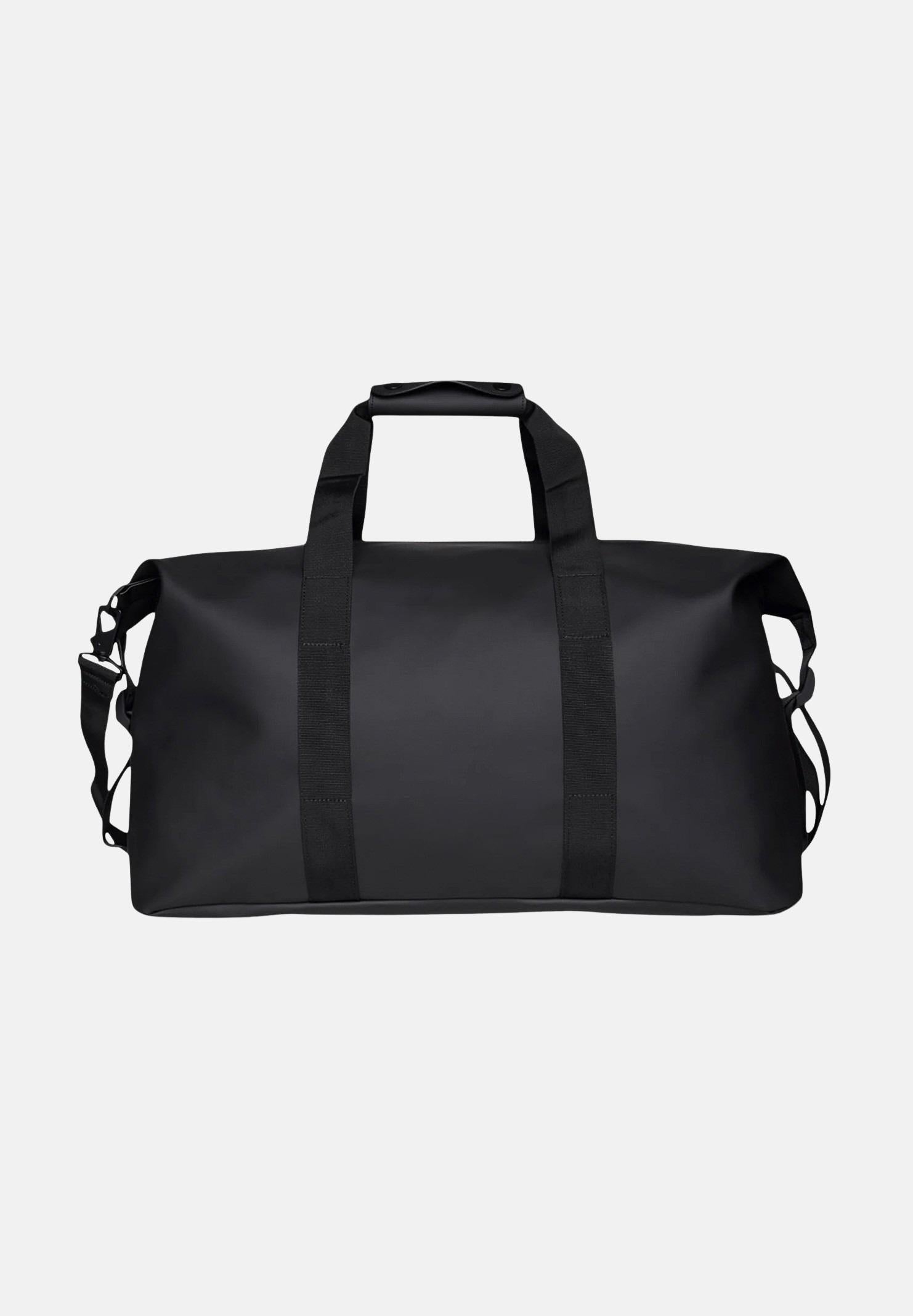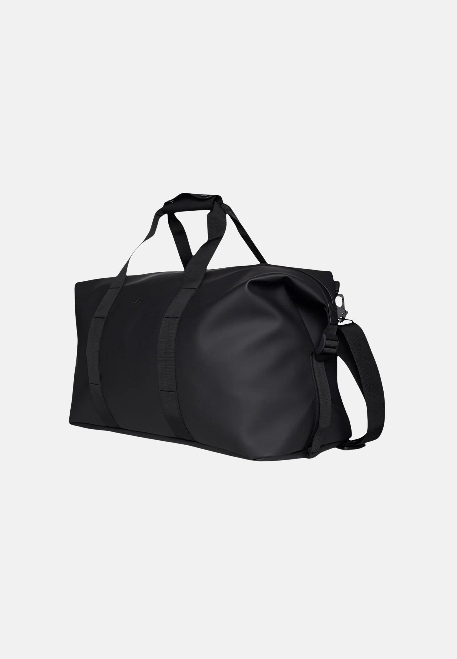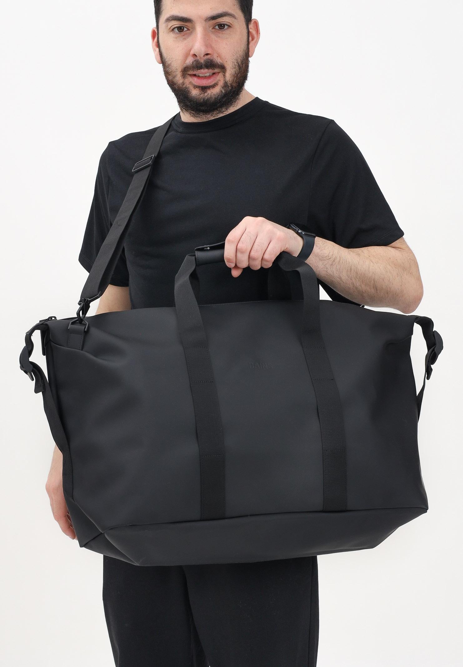 RAINS Borsone Hilo Weekend nero per uomo e donna. La Hilo Weekend Bag è la versione Rains dell'essenziale borsone per viaggi brevi, disponibile in tre misure. La Hilo Weekend Bag è un modello essenziale e contemporaneo, che unisce il tessuto impermeabile di Rains con dettagli rigidi e tracolla tipici del marchio. Aprendo la zip rivestita a tutta lunghezza troviamo un ampio scomparto singolo, con spazio per vestiti, dispositivi elettronici e altro ancora, per viaggi di lavoro o weekend fuori porta. Una volta messi in valigia, gli effetti personali rimangono al sicuro grazie alle cinghie di compressione laterali. Il design è completato da manici di trasporto in tessuto, custodia comfort e anelli di fissaggio per una tracolla rimovibile inclusa. La Hilo Weekend Bag è realizzata nell'iconico tessuto PU impermeabile di Rains, progettato per essere robusto, duraturo e piacevole al tatto. Dimensioni: 27x52x26cm. Stagione autunno inverno.