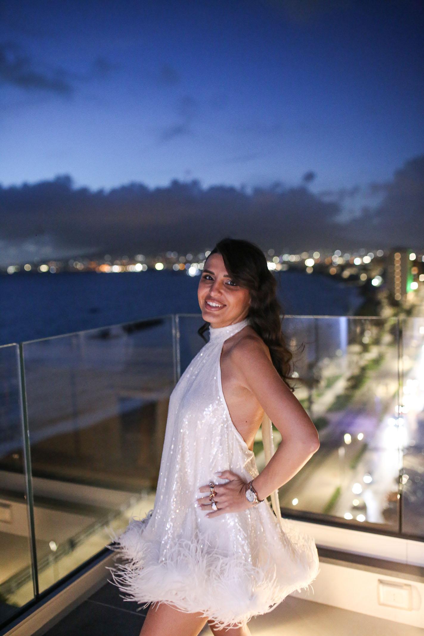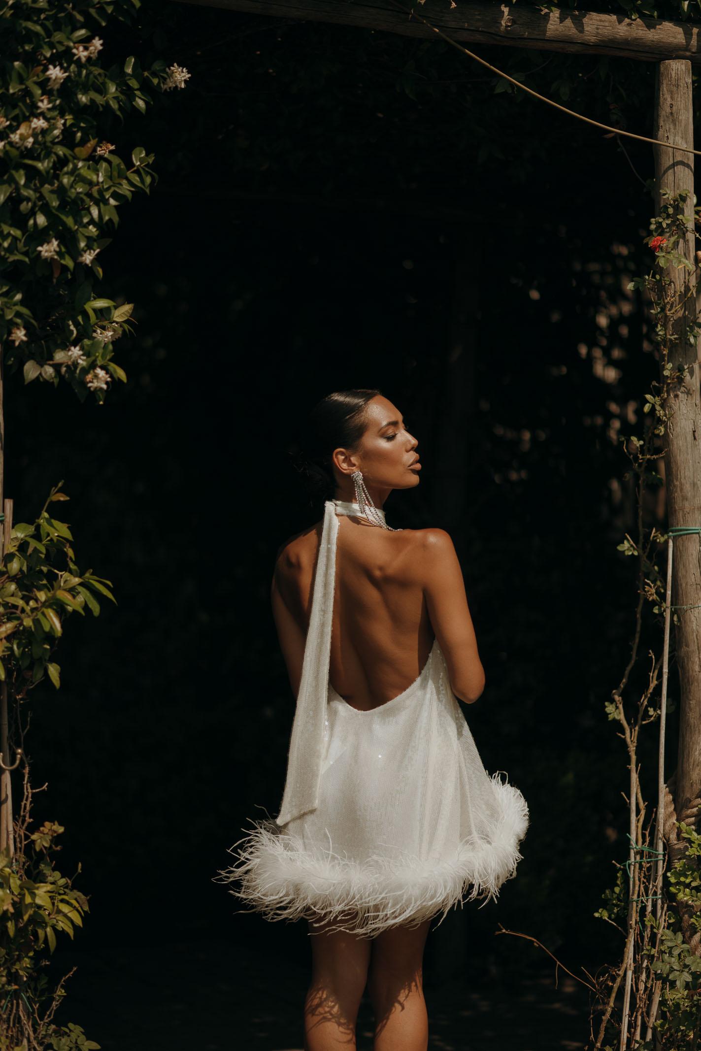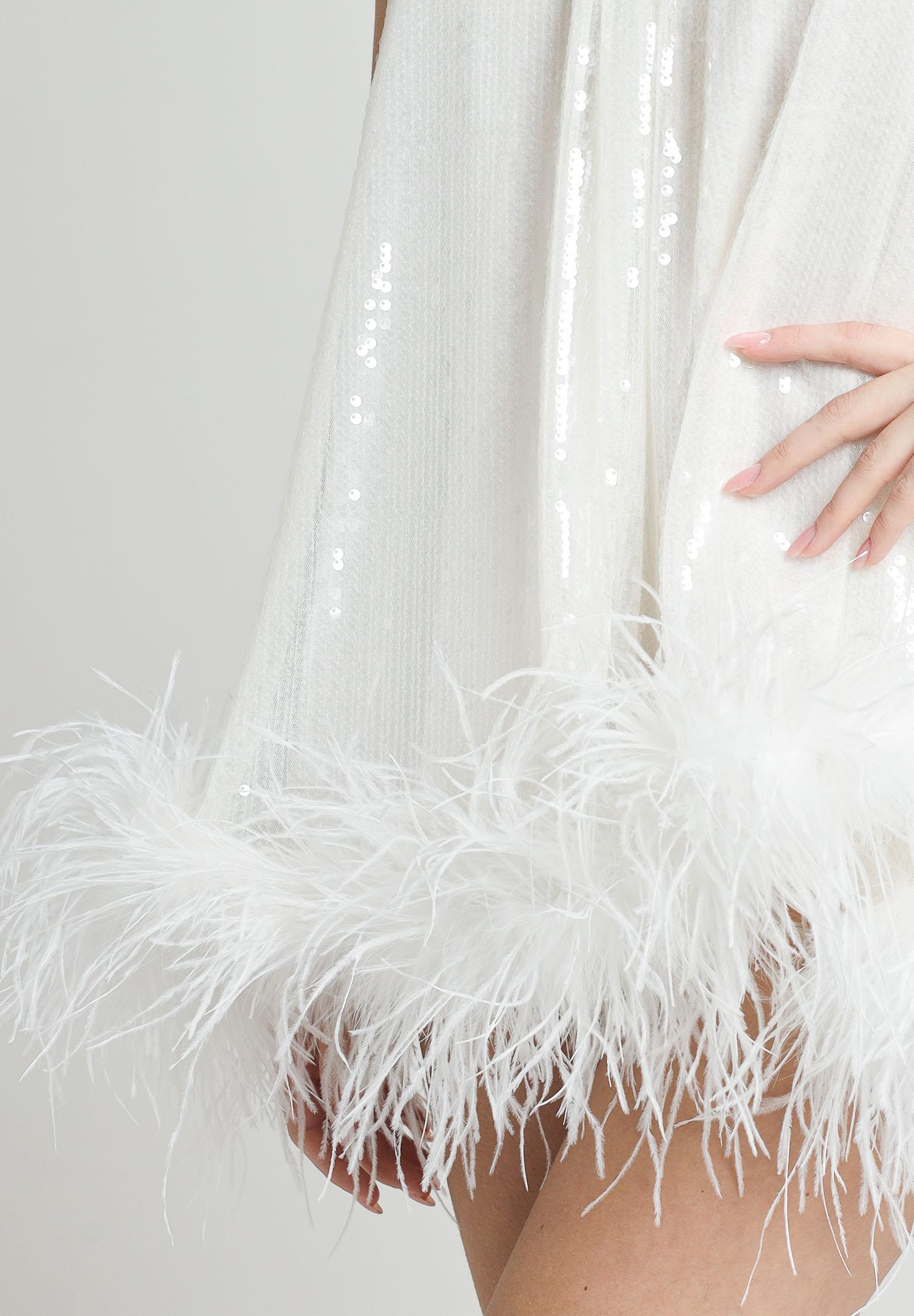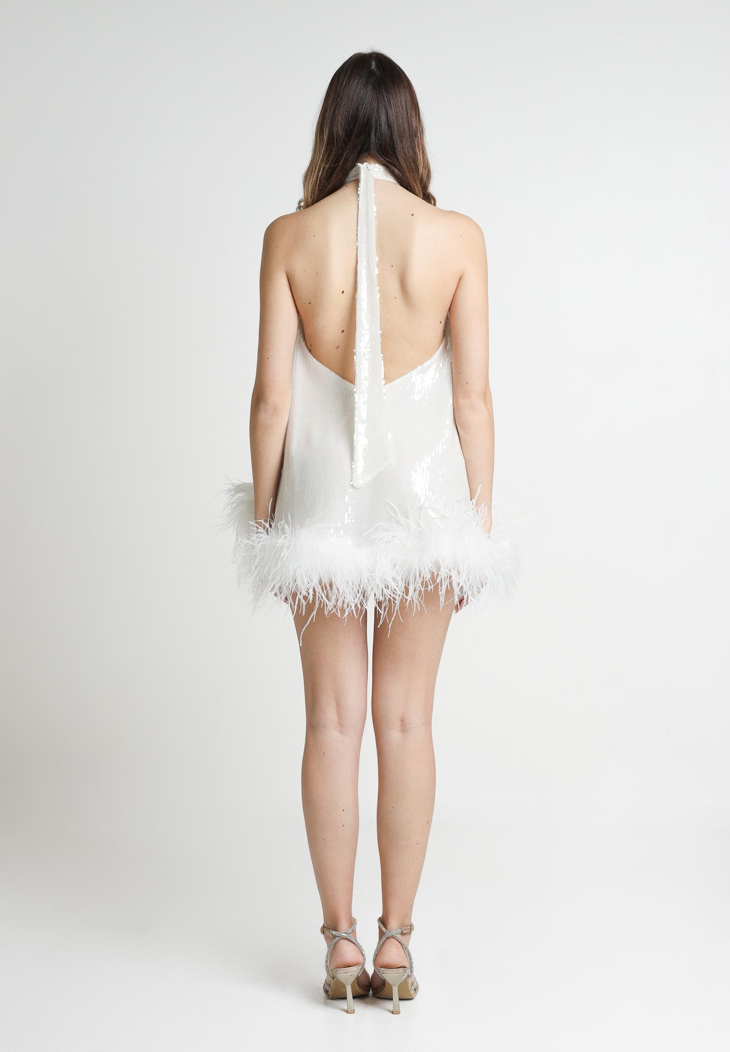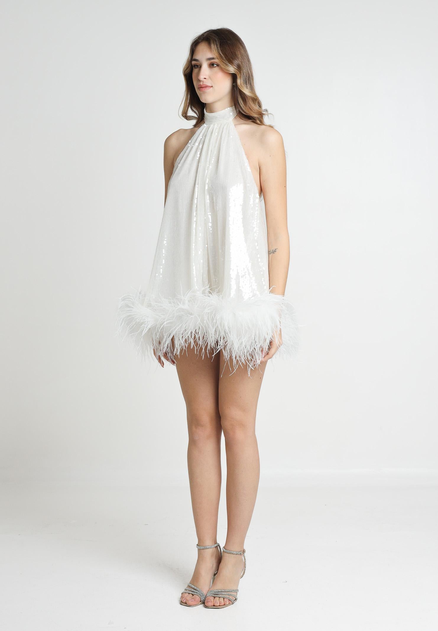 SANTAS Abito corto CUPCAKES bianco da donna, perfetto per eventi festosi. Il top, che si lega dietro il collo, presenta una scollatura alta che dona un effetto sofisticato. L'abito è realizzato in un tessuto luminoso con paillettes che catturano la luce in modo elegante. L'orlo è decorato con piume bianche. Questo abito è ideale per feste, serate di gala o eventi speciali, offrendo un look audace, ma comunque raffinato, per chi ama distinguersi. La modella indossa una taglia 40 ed è alta 170cm. Stagione primavera estate.