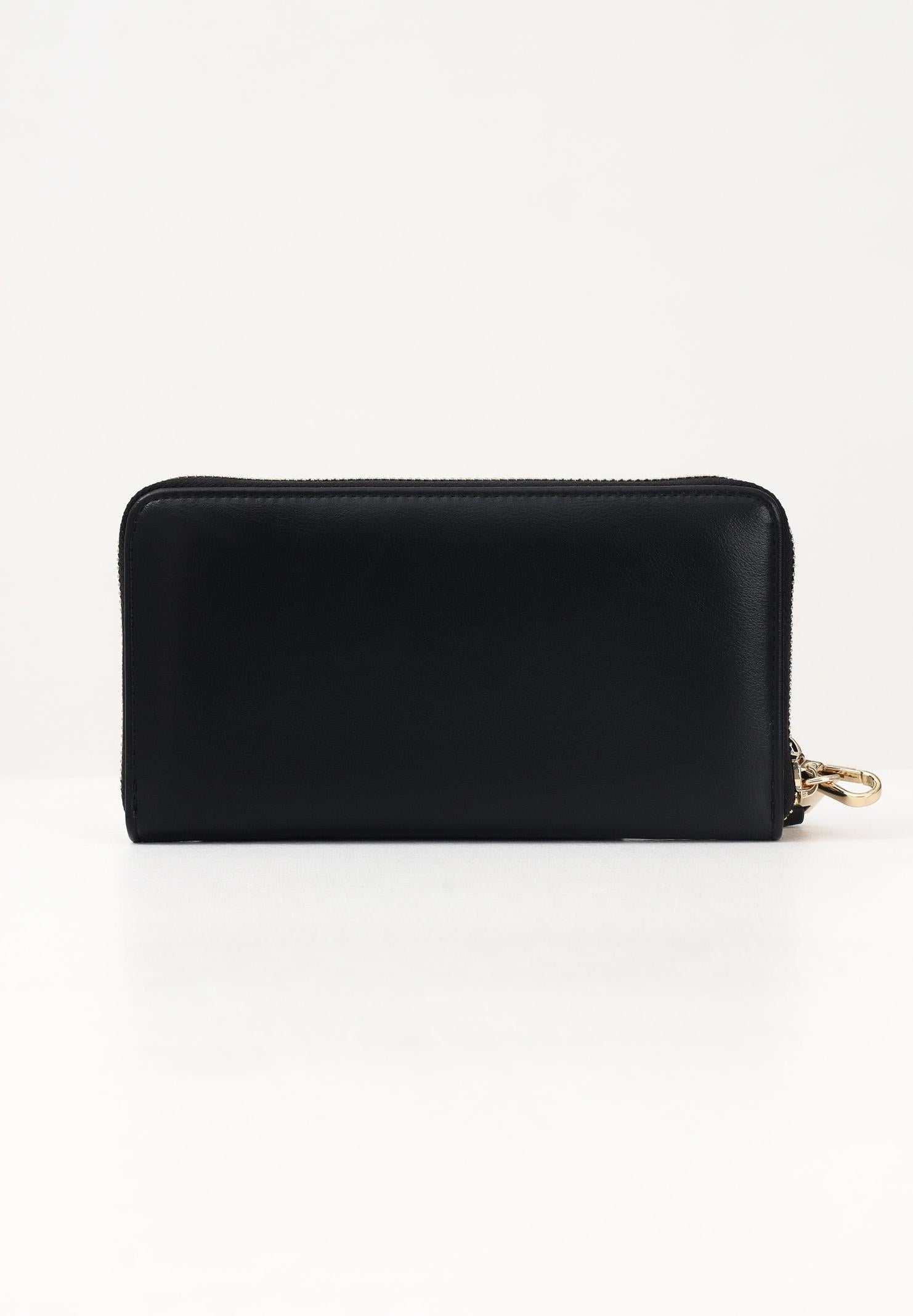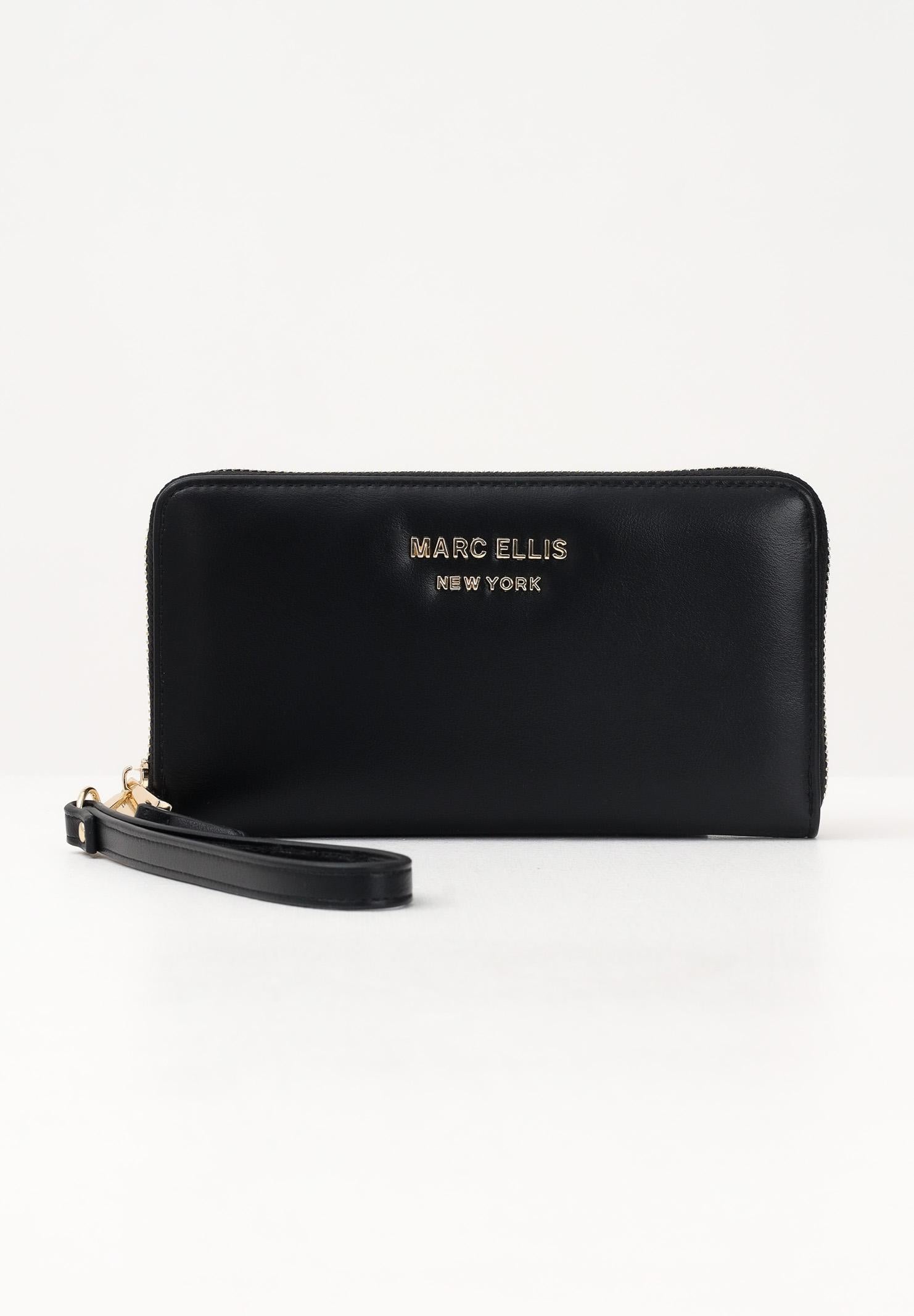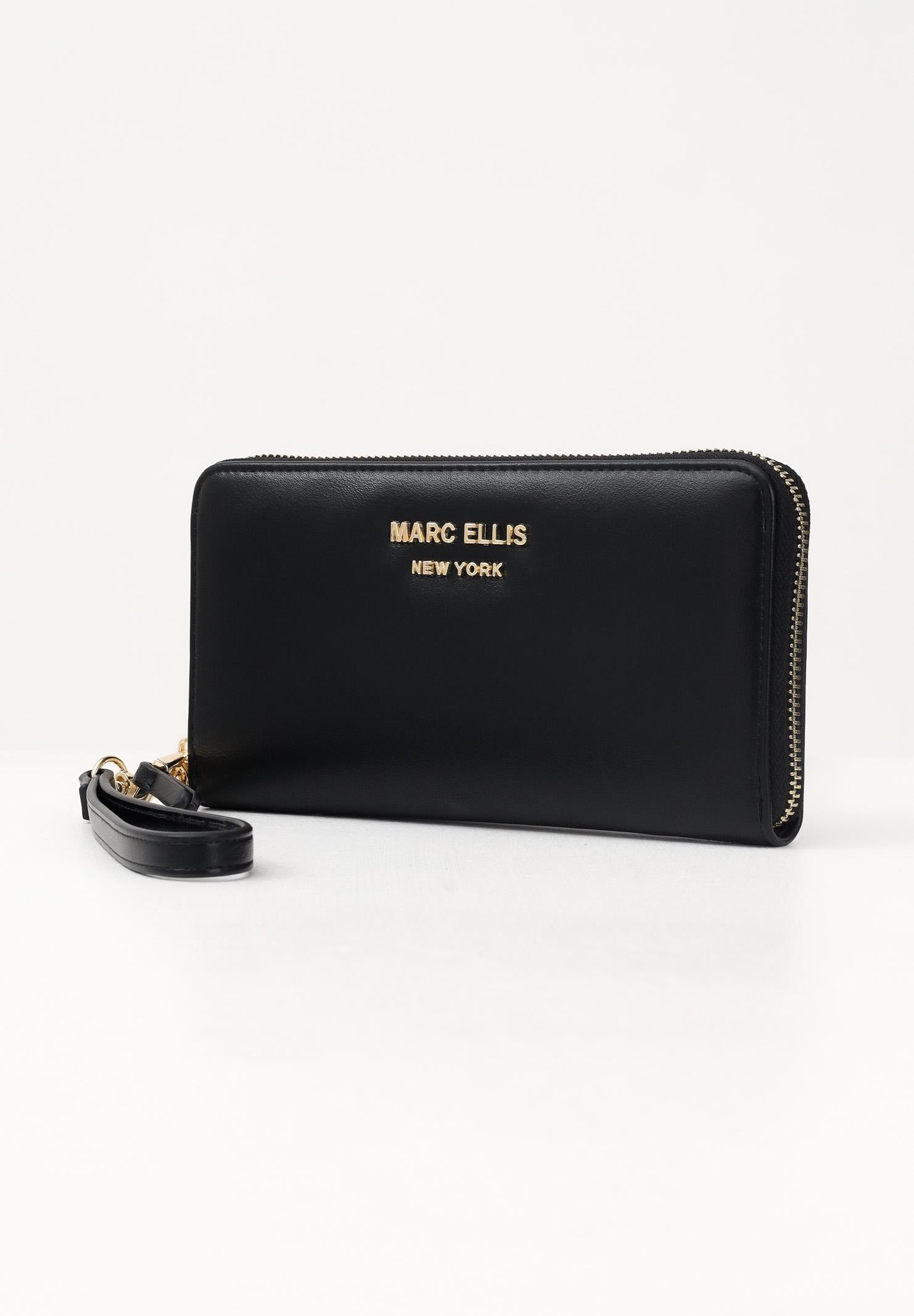 MARC ELLIS Portafogli Emy nero da donna. Presenta una chiusura con zip su tutta la lunghezza e un elegante logo dorato sulla parte anteriore. All'interno, offre ampio spazio per carte di credito, monete e banconote, con un design ben organizzato per la massima funzionalità. Un accessorio elegante e pratico per ogni occasione. Dimensioni: 19cm larghezza, 10,5cm altezza, 2cm profondità. Stagione autunno inverno.