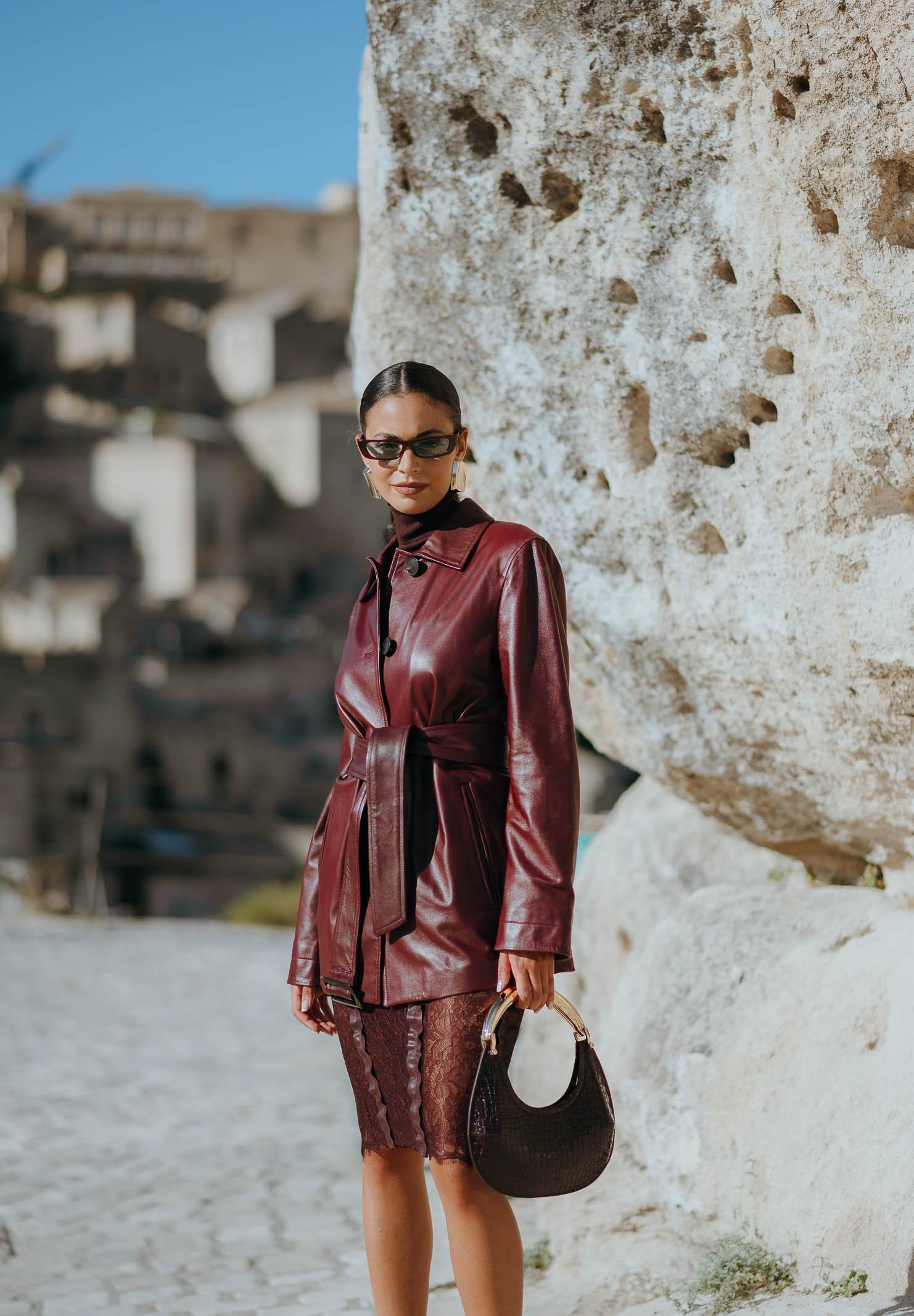 MAX MARA Giacca in morbida nappa bordeaux da donna con cintura