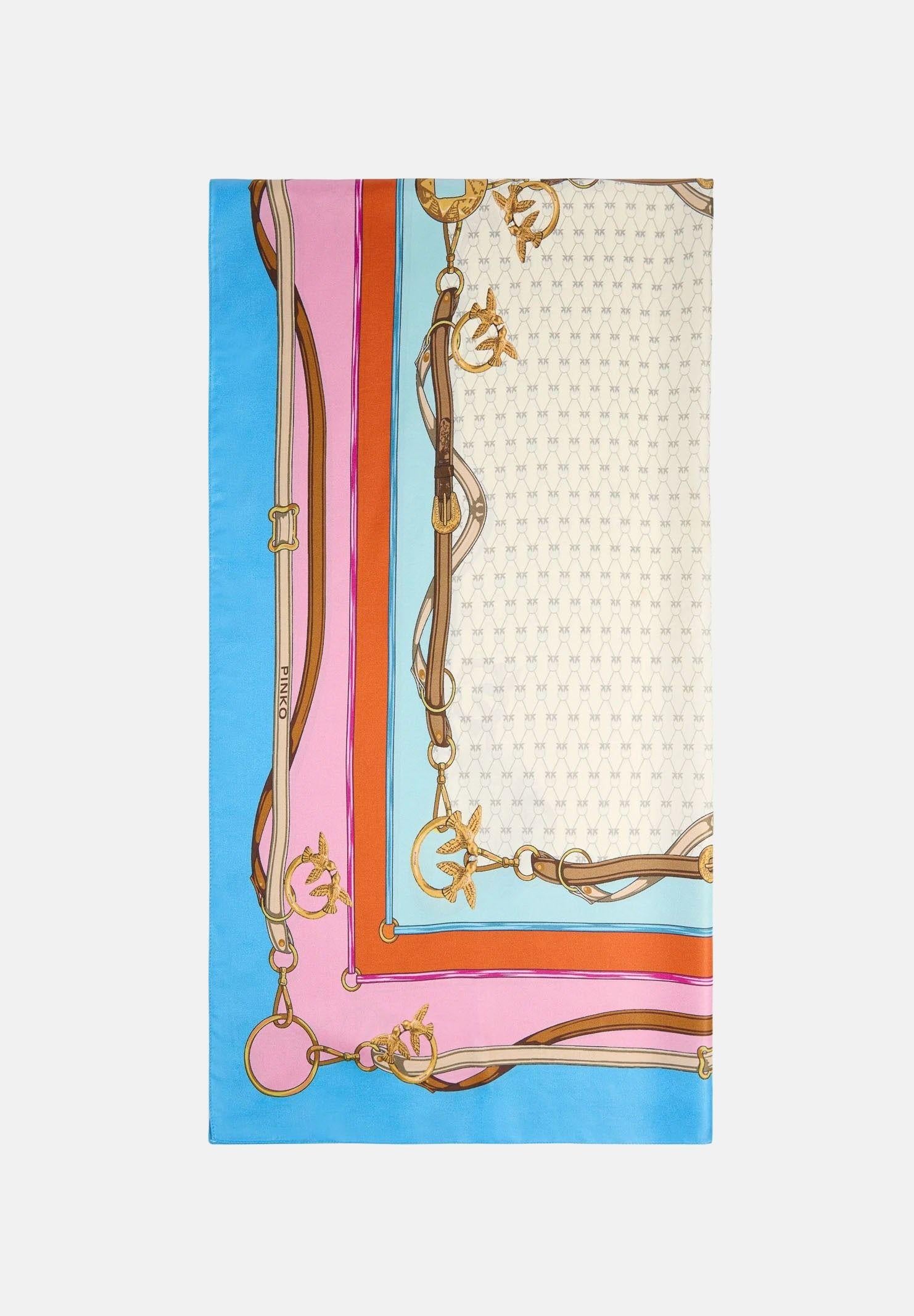 PINKO Foulard LIMBO multicolore da donna realizzato in morbido twill di misto seta. Il modello è impreziosito da una stampa in cui il sobrio micro motivo con logo Love Birds della parte centrale incontra le maxi righe multicolor del bordo, completate da un disegno con cinturini e ciondoli Love Birds per un raffinato richiamo al mondo della pelletteria. Un accessorio originale e femminile, perfetto per completare i tuoi outfit in puro stile PINKO. Dimensioni: 86x86cm. Stagione primavera estate.