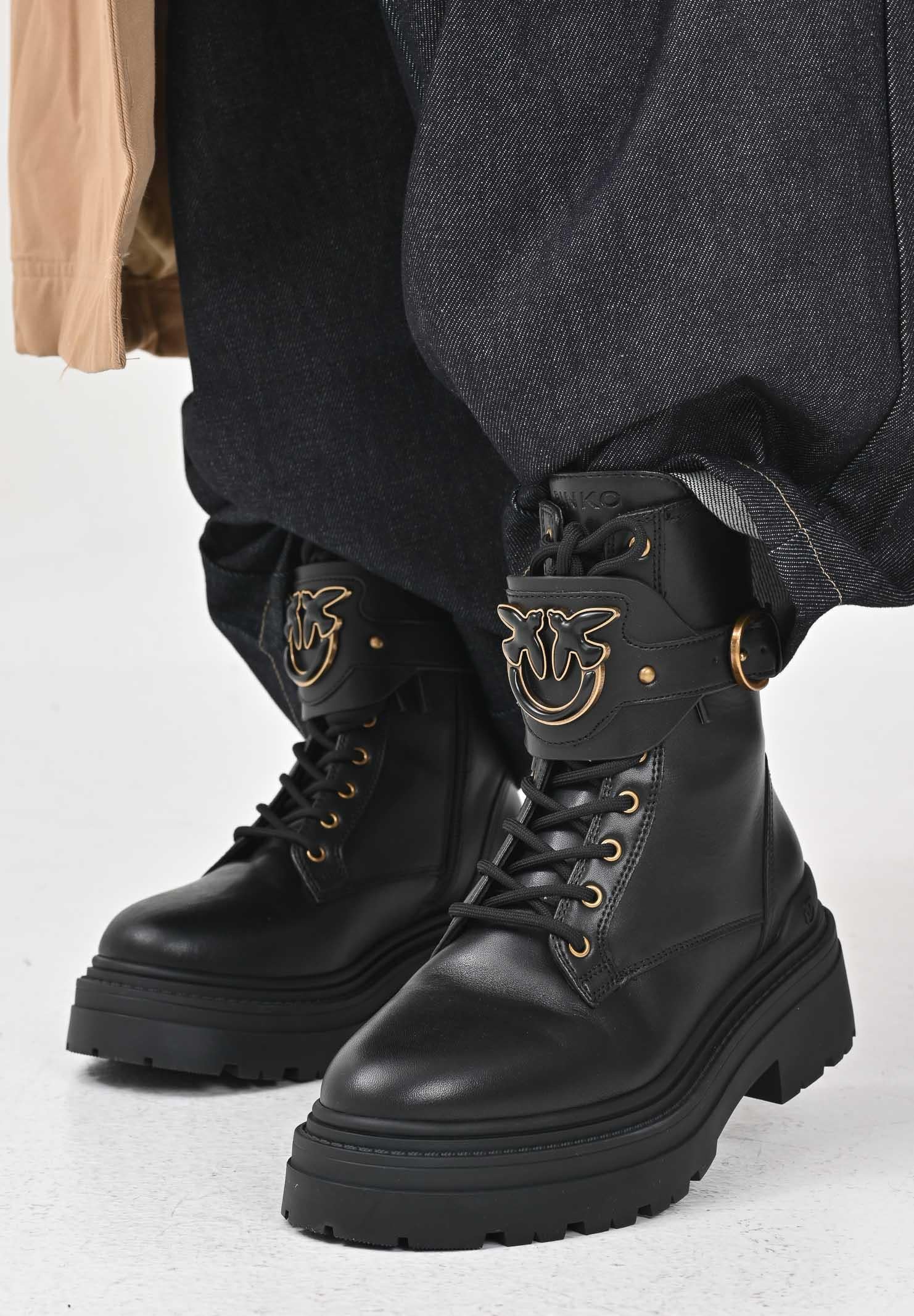 PINKO Anfibi neri da donna caratterizzati da un cinturino regolabile con fibbia arricchito sul davanti dal logo Love Birds con profili metallici. Il modello, realizzato in pelle, è dotato di una zip sul lato interno del gambale e di un passante posteriore per facilitare l'indosso. È completato da una suola carrarmato in gomma con tacco 5,5 cm, fodera e soletta in pelle. Gli anfibi sono l'ideale per conferire ai tuoi look casual un tocco di audacia in più. Stagione autunno inverno.