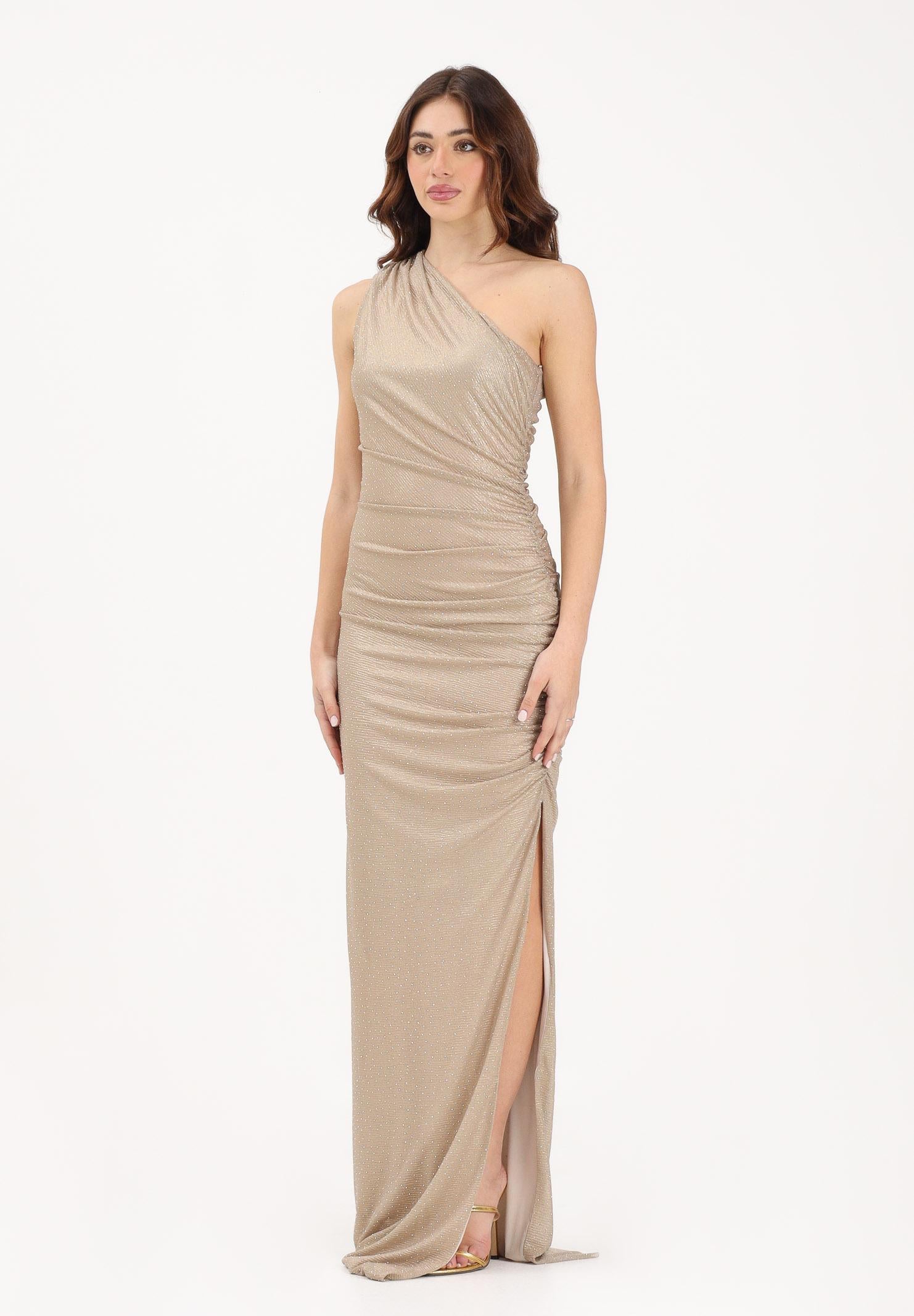SHIT Abito lungo oro da donna in tessuto stretch laminato. Il modello è caratterizzato da una linea aderente e femminile, con drappeggi strategici lungo il busto e sui fianchi che valorizzano la silhouette. Il design monospalla crea un look sofisticato e sensuale, lasciando una spalla scoperta e accompagnandosi a una stola coordinata nello stesso tessuto, venduta insieme all'abito, perfetta da indossare morbida sulle spalle o annodata al collo per un effetto ancora più glamour. La gonna lunga scivola fluida fino a terra ed è completata da uno spacco laterale che slancia la figura e dona movimento. La modella indossa una taglia 40 ed è alta 170cm. Si consiglia un lavaggio delicato ed una stiratura a media temperatura. Stagione primavera estate.