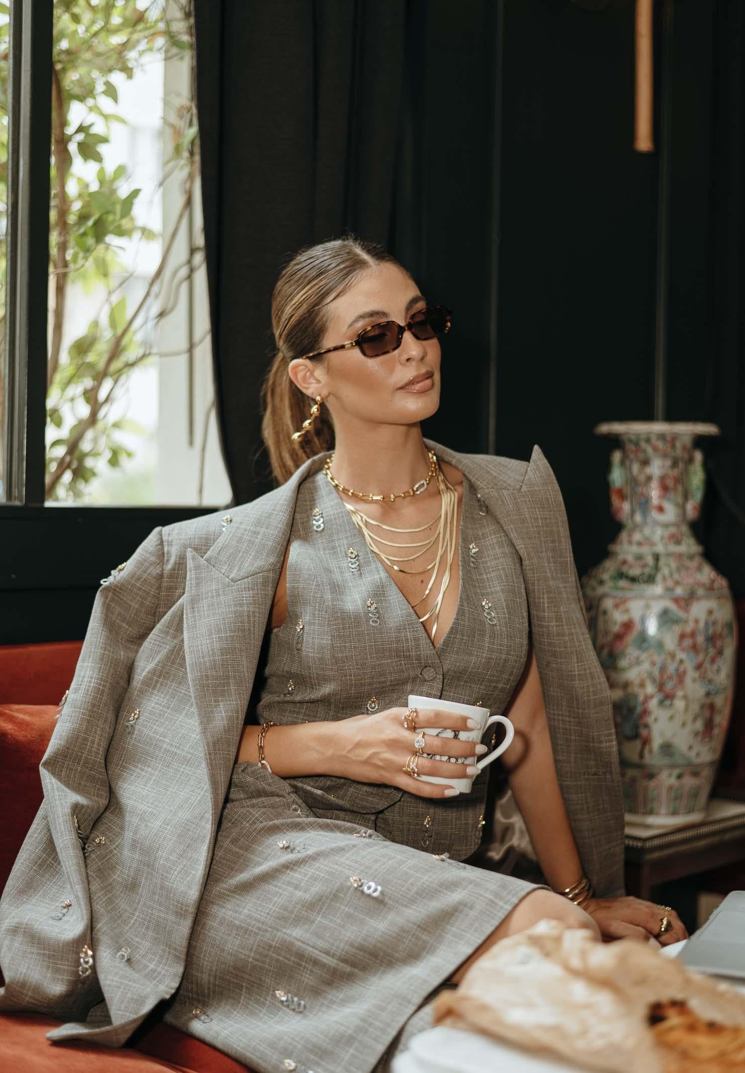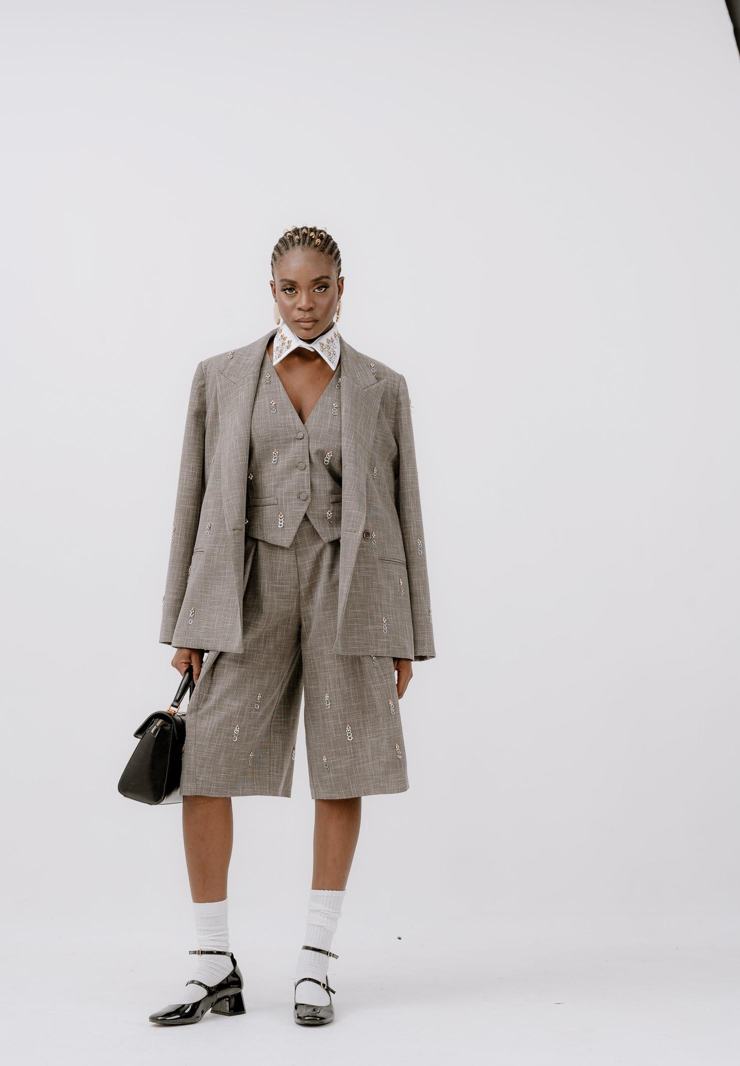 SIMONA CORSELLINI Giacca grigia da donna. Il design è arricchito da piccoli dettagli metallici applicati su tutta la superficie, che donano un tocco moderno e ricercato al classico motivo check. Il modello è strutturato, con spalle leggermente ampie e rever classici, mentre la chiusura doppiopetto valorizza la silhouette. Sul retro è presente una cintura sottile nello stesso tessuto, che permette di regolare la vestibilità in vita. La giacca, dal fascino contemporaneo e sofisticato, è ideale da indossare sia in coordinato con il bermuda abbinato, per un look deciso e di tendenza, sia come capo singolo per dare carattere ad outfit più basici. La modella indossa una taglia 40 ed è alta 170cm. Si consiglia una stiratura a media temperatura. Stagione autunno inverno.